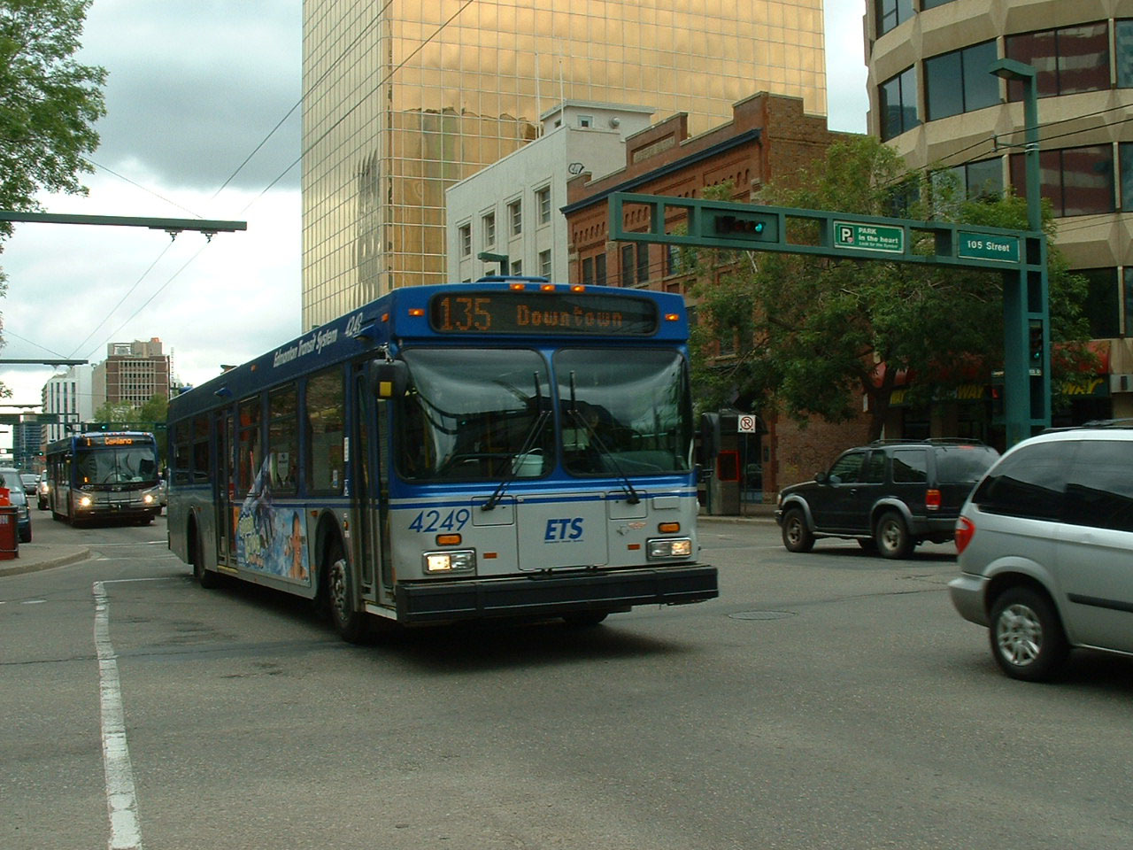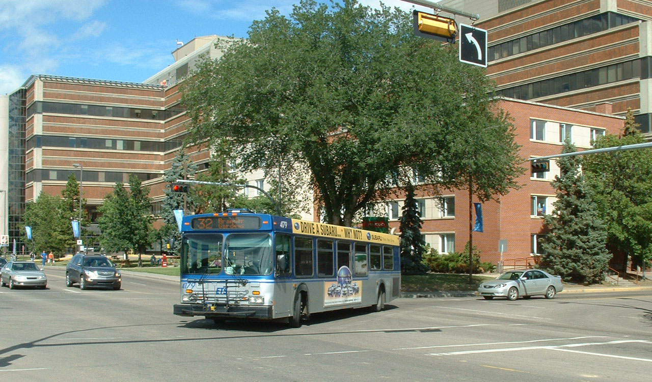 New Flyer 1998 D40F 4076 can just be seen emerging from one of the several bridges crossing the North Saskatchewan River.