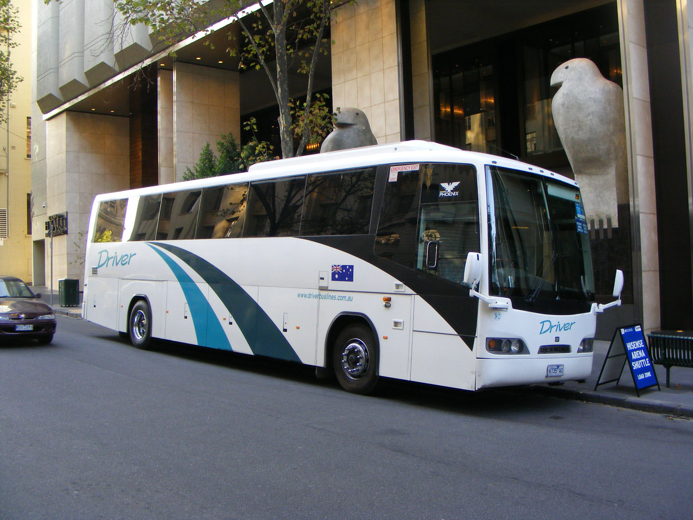 Driver's coach of choice is still the Denning Phoenix and this Silver version, dating from 2007, 82 (6735AO), is seen working a shuttle to the Hisense Arena in Melbourne in April 2012. However many Scania coaches are joining the fleet after an initial batch, including three secondhand examples from Victoria Touring Coaches. |