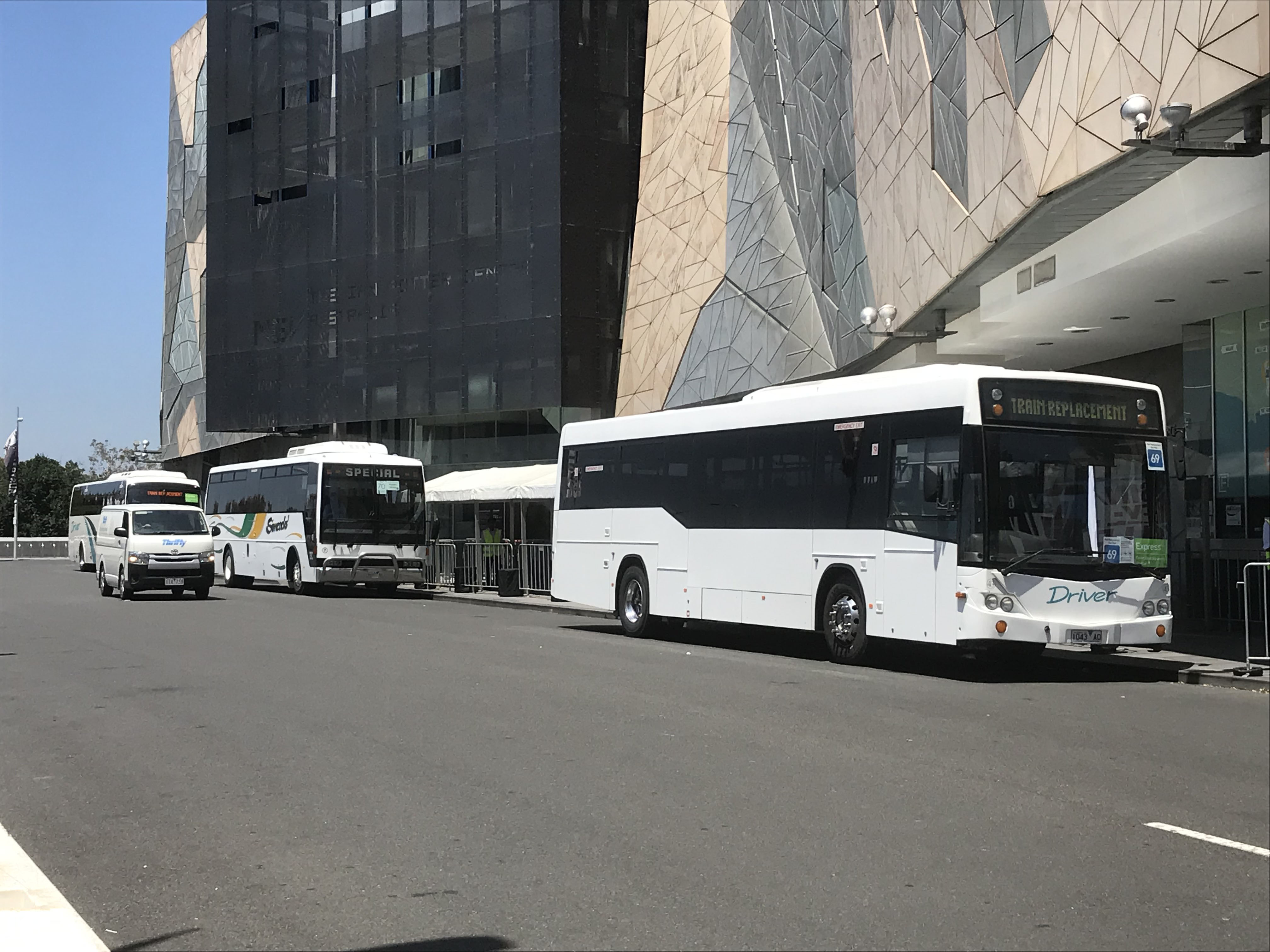 A mammoth rail replacement exercise throughout January 2019 saw the Dennings had at work. Here is 43, repainted in plain white, at the back of Federation Square with a Simcock's coach and a fleet Higer A30 bodied Scania. Many other vehicles in use were standard buses so passengers were in for a treat when they boarded these Driver buses with smart interiors and comfy coach style seats.