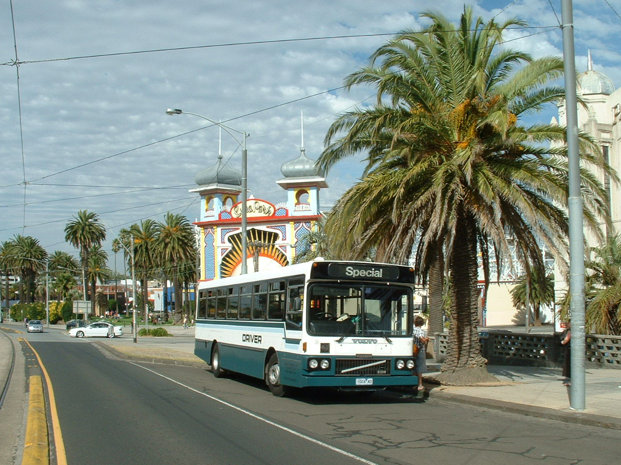 Luna Park forms the backdrop to Driver Volvo B10M 24 (1024AO). The bus is on a dead run to take up service on route 623 from St Kilda to Glen Waverley. The bus has a 42 seat dual door body by Volgren. It was one of a pair nearly 18 years old when seen at St Kilda in Easter 2004. The bus was sold to Stonestreet in Toowoomba.