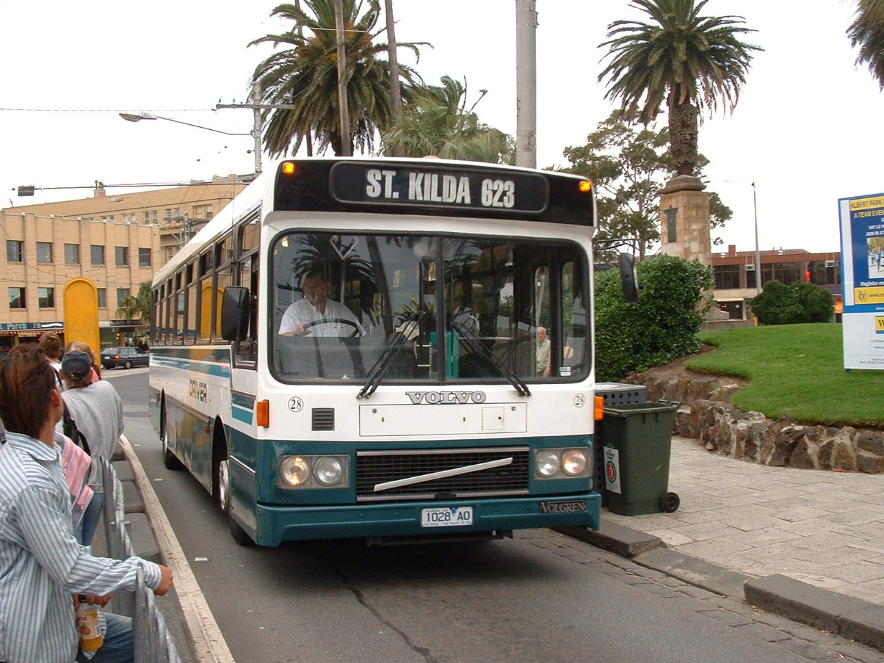 Volgren bodied Volvo B10M 28 (1028AO) on layover in St Kilda. The 1989 bus remained in the fleet after the sale of bus services to CDC. |