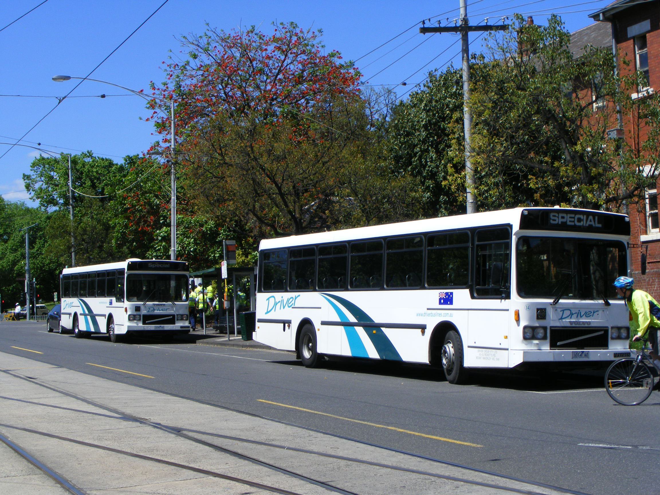 Two Volgren B10M buses led by 14 (1014AO) seen on "Special Duties" in October 2011. Volvo 14 of 1991 also remained in the fleet after the sale to CDC. |