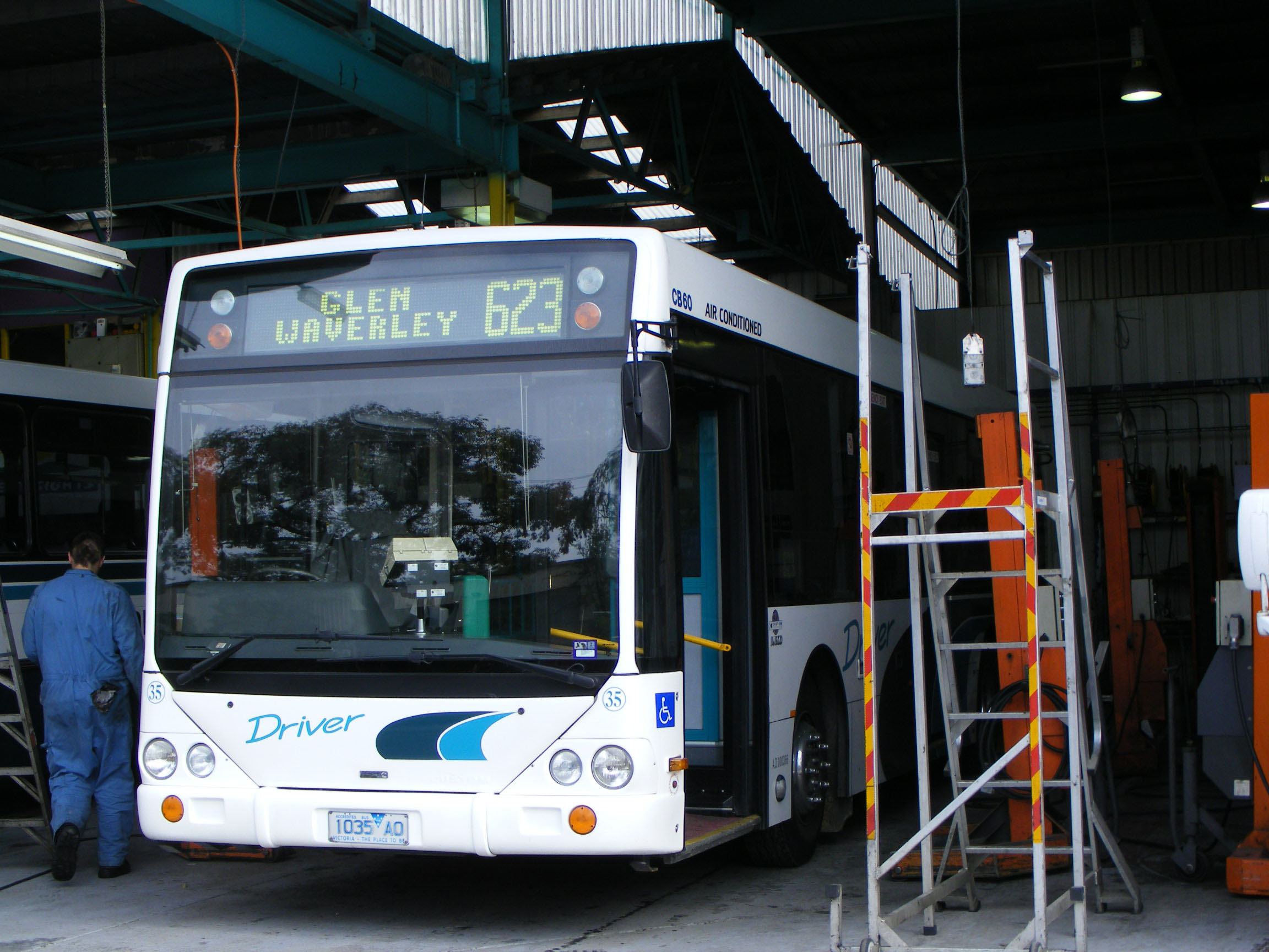 Side by side at Mount Waverley depot in August 2008 are Volgren bodied Volvo B6LE 41 (1041AO) and Custom CB60 bodied Irisbus Metro 17.250 69 (5569AO). By December the Volvo had been replaced by a Denning CAT/Custom bearing the same registration and fleet numbers. The new Denning and Irisbus 69 passed to CDC Eastrans, and the B6LE ended up with Loves Cairns operation as 346LOX, but has since been withdrawn. |