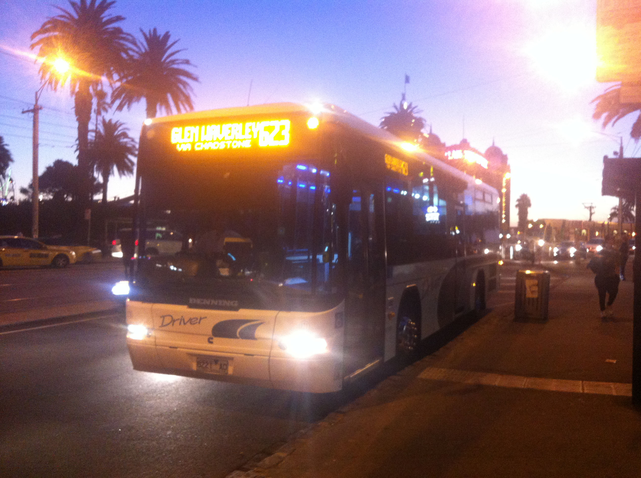 The sun sets on Denning Phoenix 121 (8221AO) at St Kilda in February 2013. The bus passed to CDC Eastrans. |