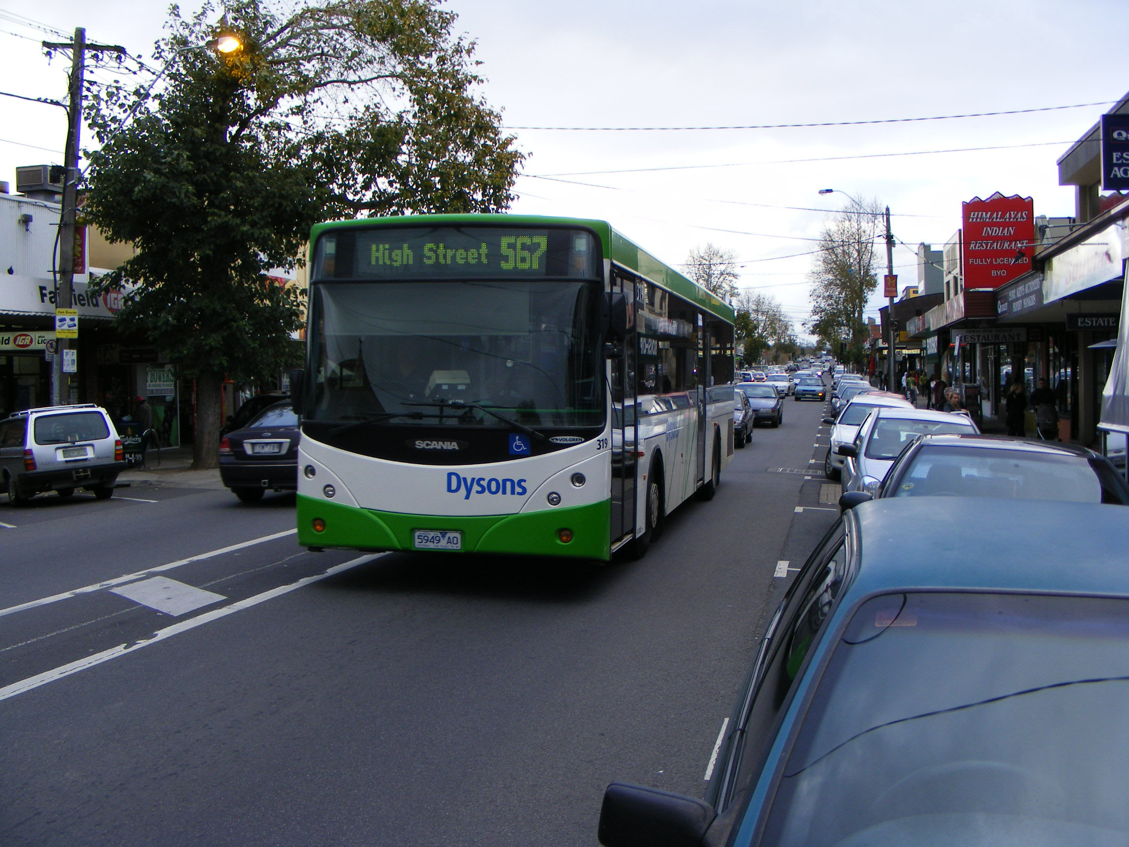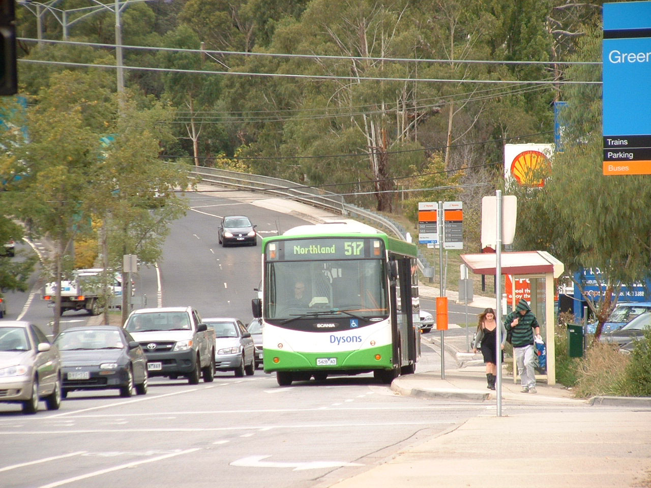 By 2007 Dysons had adopted this fresh green image with blue trimmings. The bus fleet had become even more standardised on the Scania/Volgren combination. Dyson 297 (5428AO), a L94UB/CR227L is seen near Greensborough Station on the 518 to Northland Shopping Centre.