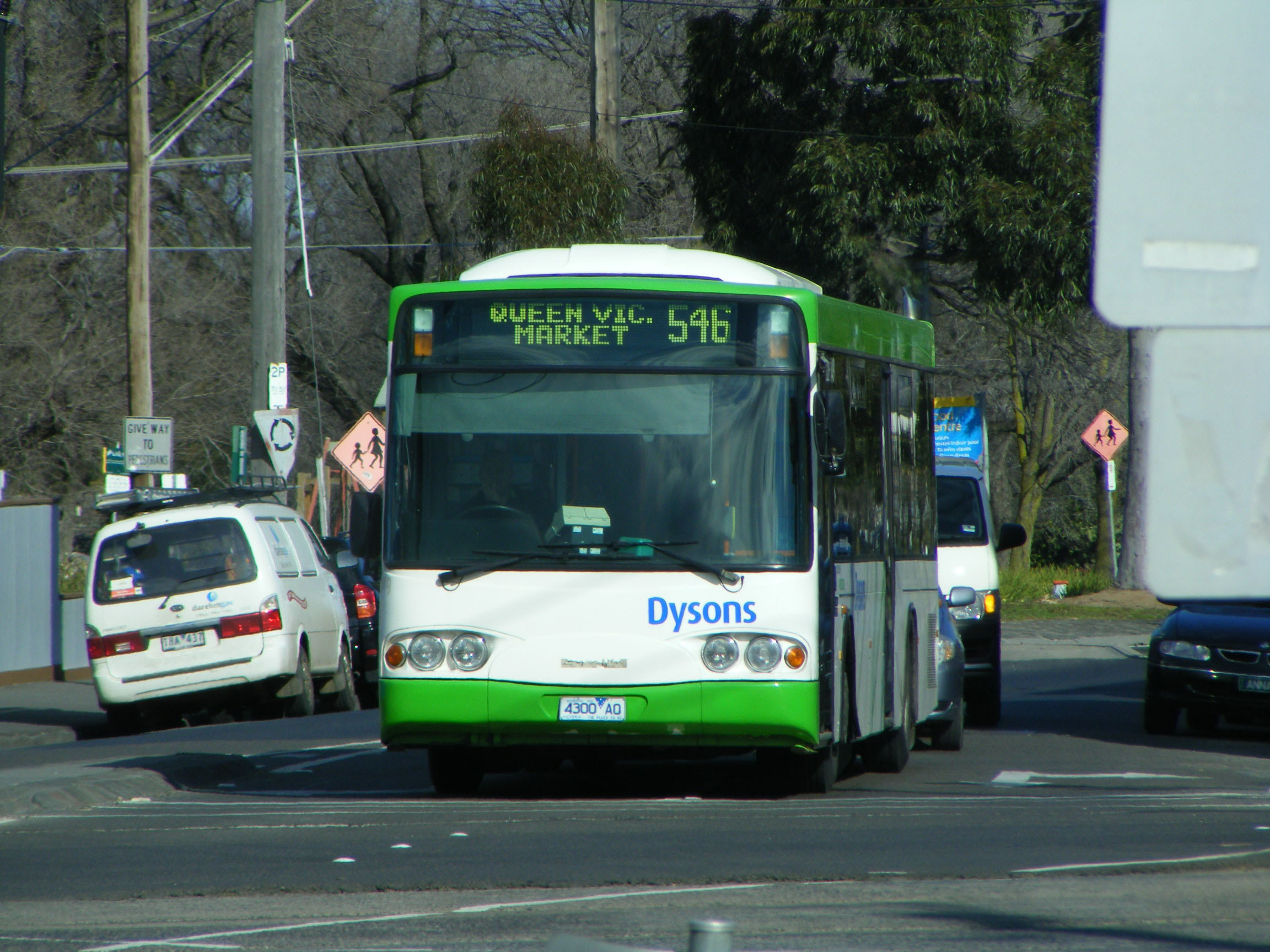 The 546 is a route which wiggles in a north east-south west direction across Melbourne from Heidelberg to Melbourne University. Off peak, as seen in August 2008, it extends to Melbourne's famous Queen Victoria Market. The bus is eight year old Scania L94UB 149 (4300AO) with the bug eyed Volgren CR222L body.
