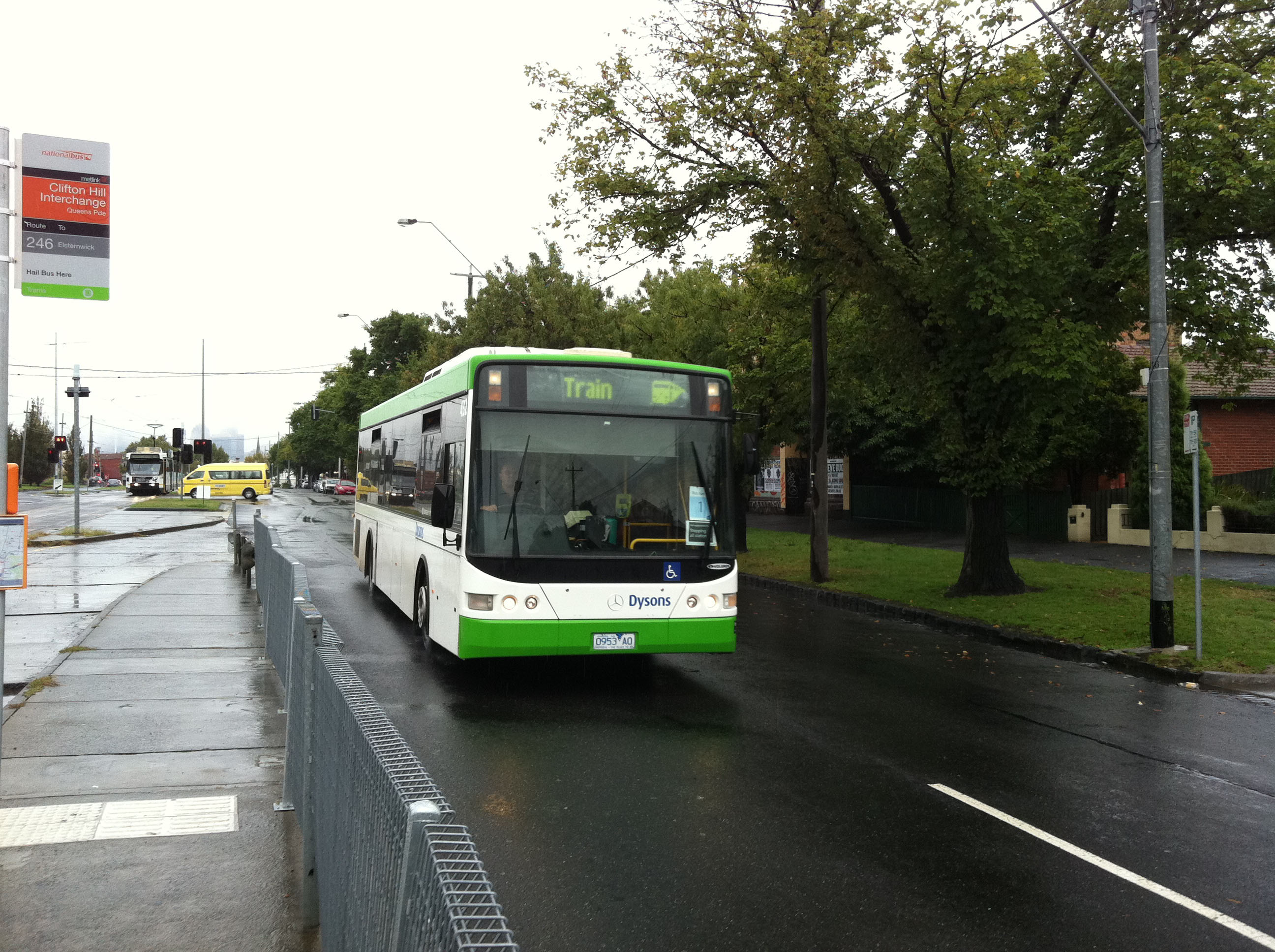 A wet day in March 2012 was probably not the best weather for running train replacement services but major track work starting at Clifton Hill resulted in a large fleet of Dysons buses on hand to carry displaced passengers. This is 432 (0953AO) which had been new as Northern Bus Lines 3. It was one of a number of Mercedes inherited form the Glenroy based company, in this instance an O500LE dating from 2003 and one of four new that year. |