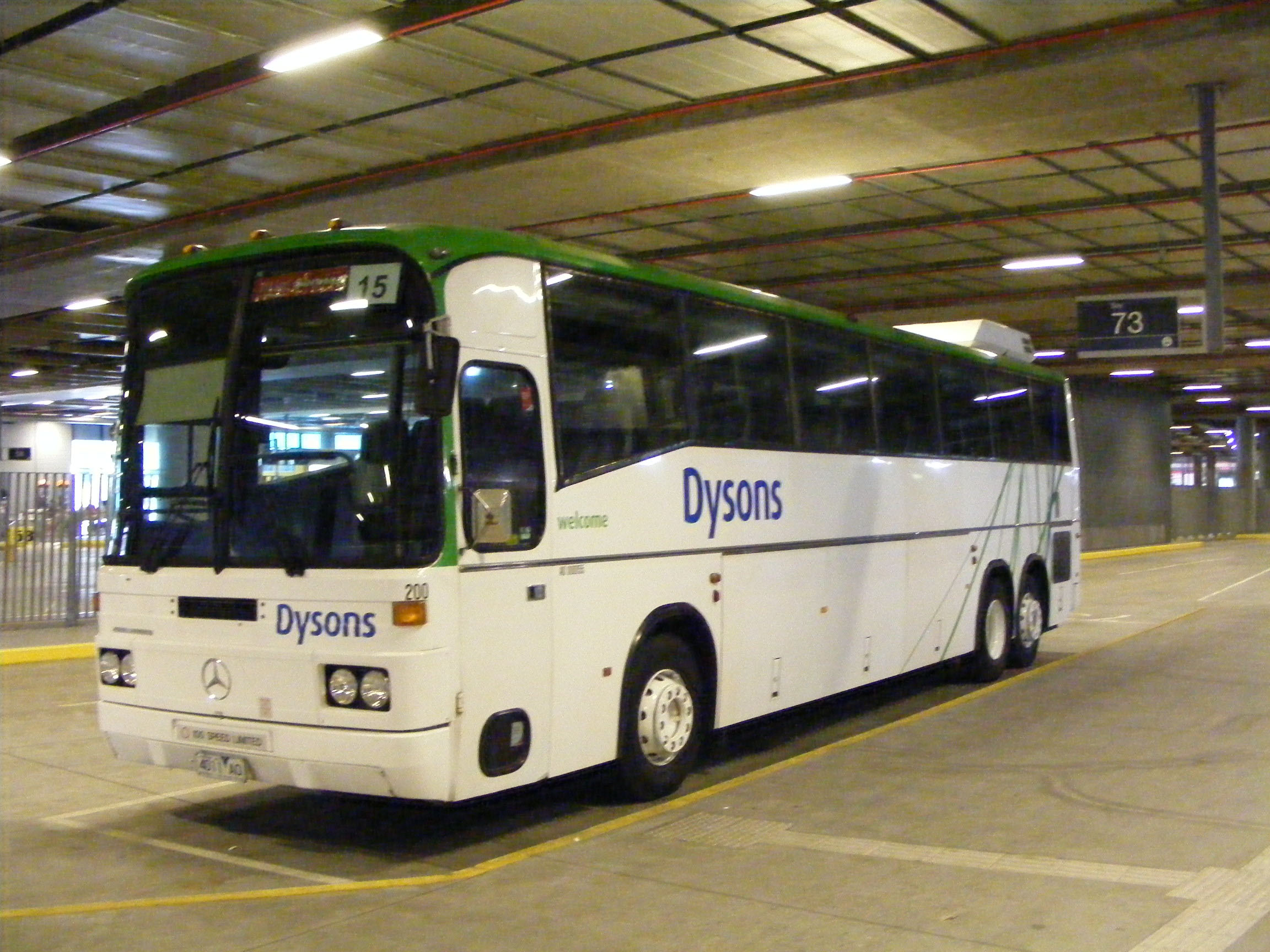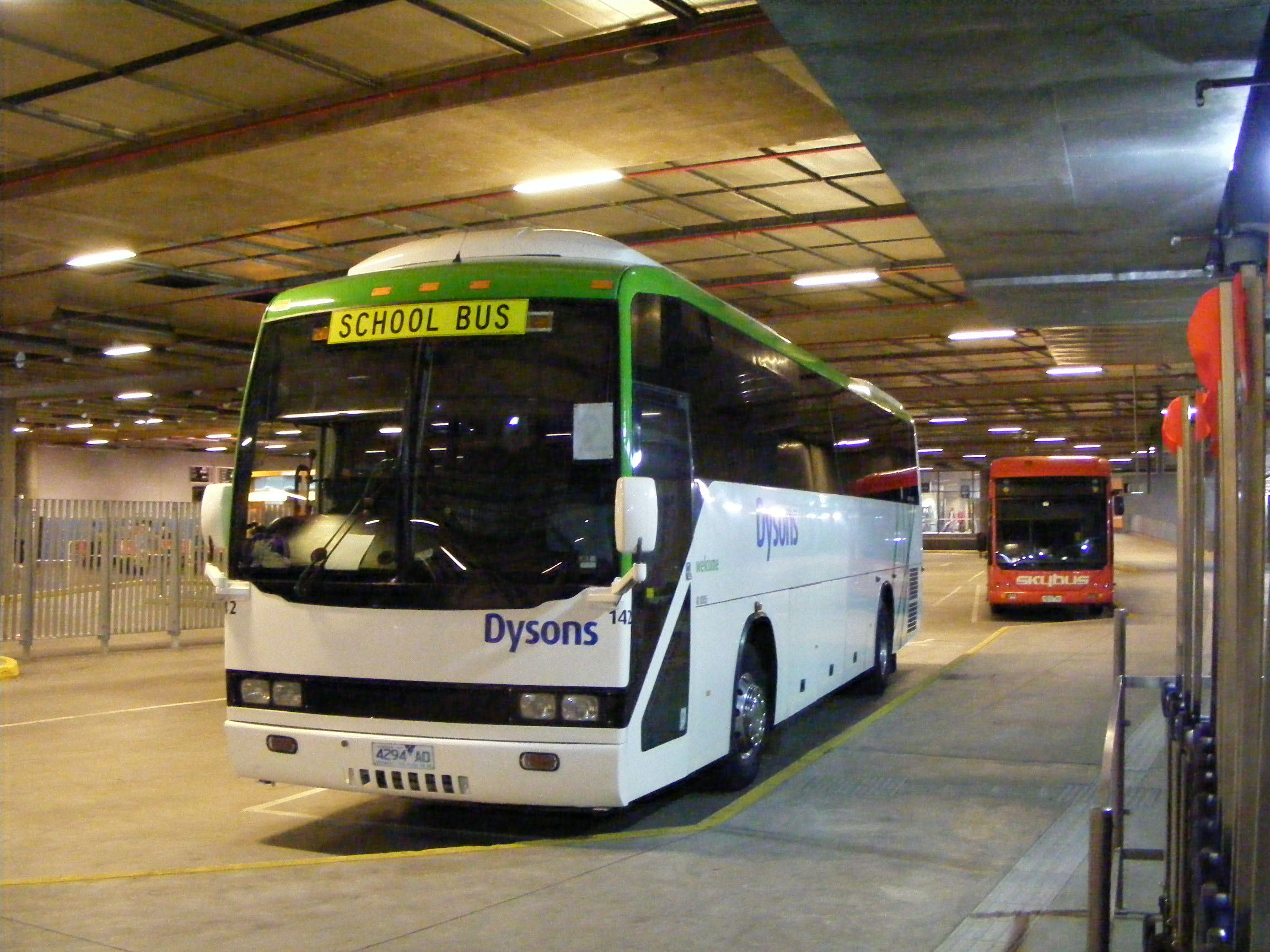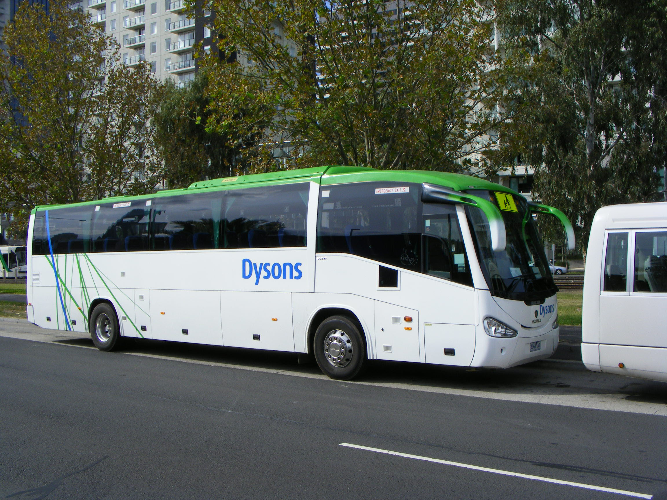In April 2008 Dysons purchased four Scania K420EB 14.5 metre Irizar Century bodied coaches for V-Line work. In May a fifth arrived in the shape of 475 (6961AO) seen here near the Melbourne Exhibition Centre in April 2010. In contrast to the other four it is only a two axle Scania K270IB with the lower 3500 body and a full 57 seater. The longer V-Lines (471-474) are 58 seaters with toilet and disabled access lift in the higher 3700 body. |