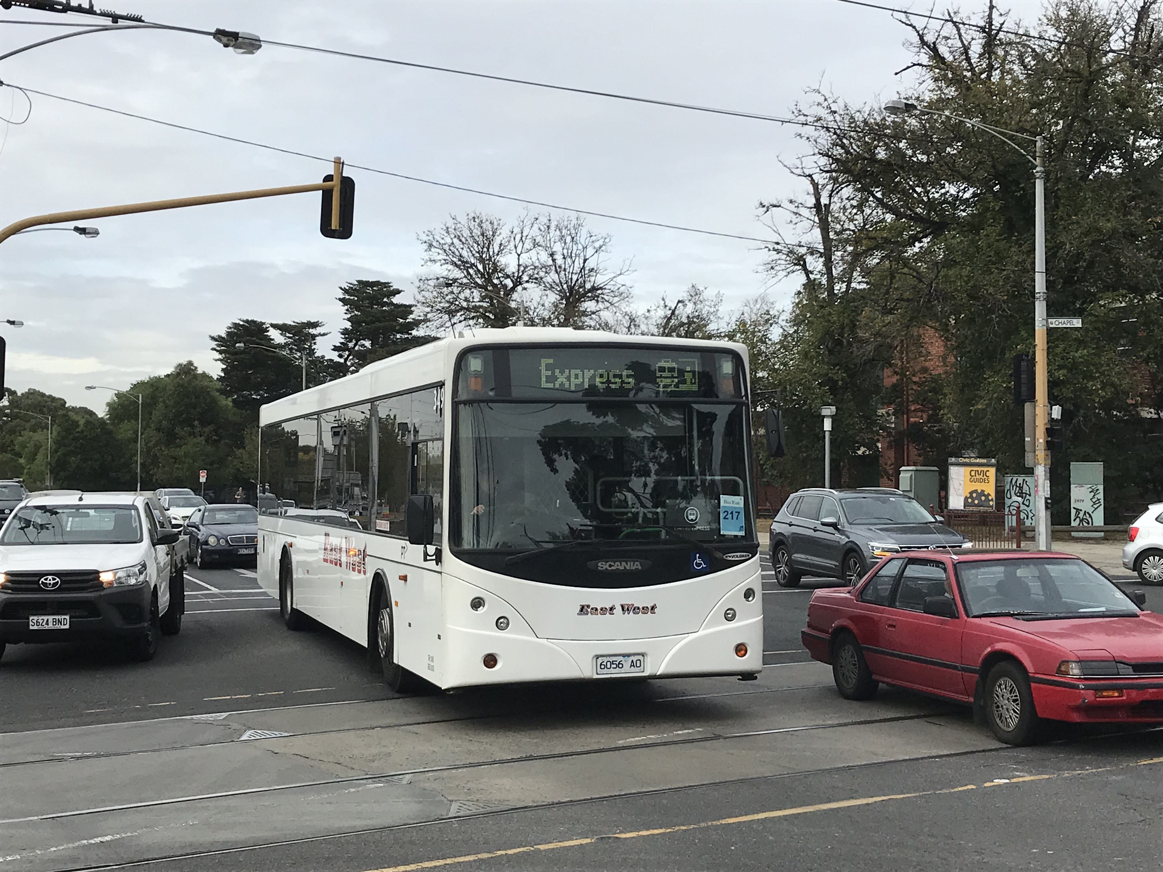 Seen doing rail replacement work, crossing Chapel Street in Windsor on Dandenong Road in April 2019, is another CR227L bodied L94UB, 349 (6056AO). The bus was new to Dysons in 2006 but was transferred to East West as fleet number 4. When seen it had regained fleet number 349 and is believed to have since lost East West fleet names for Dysons.
