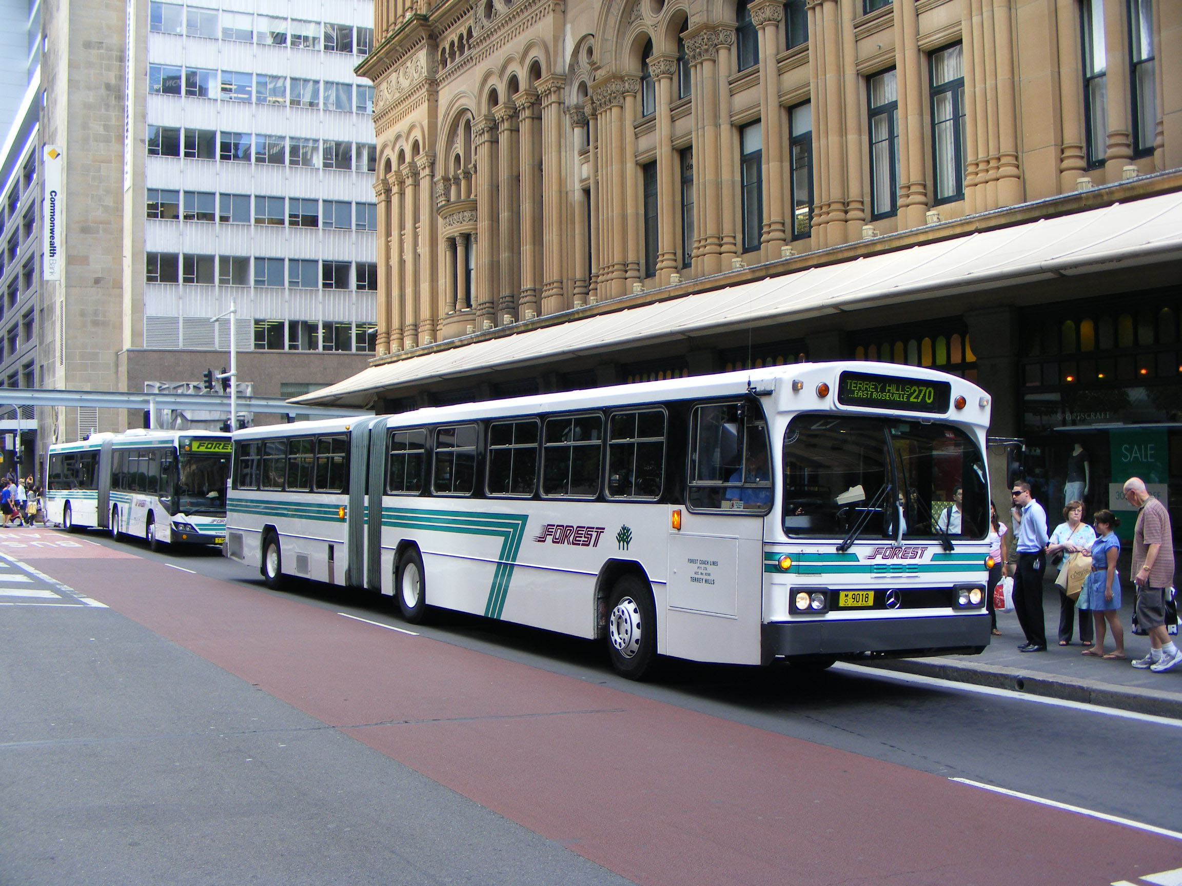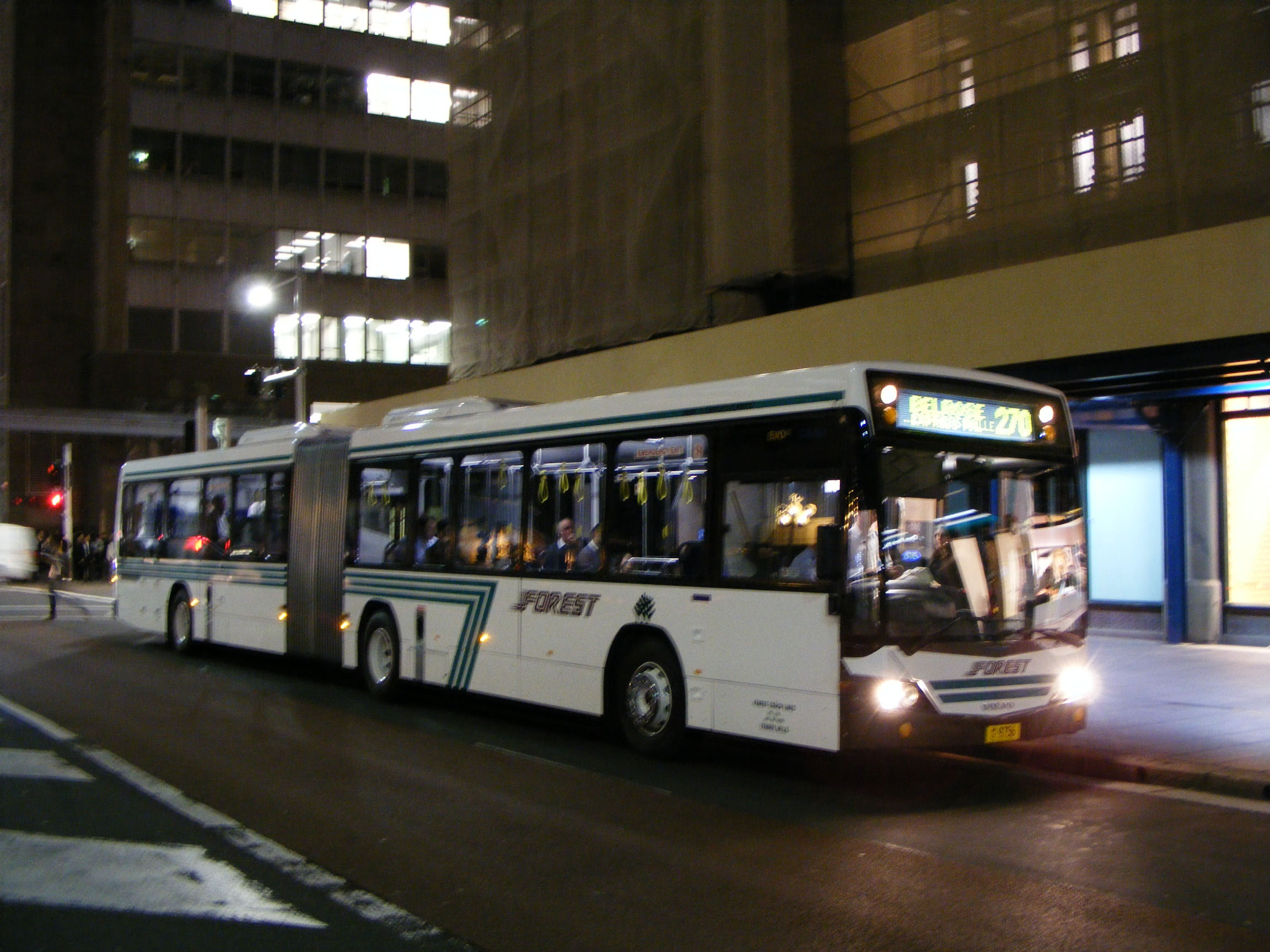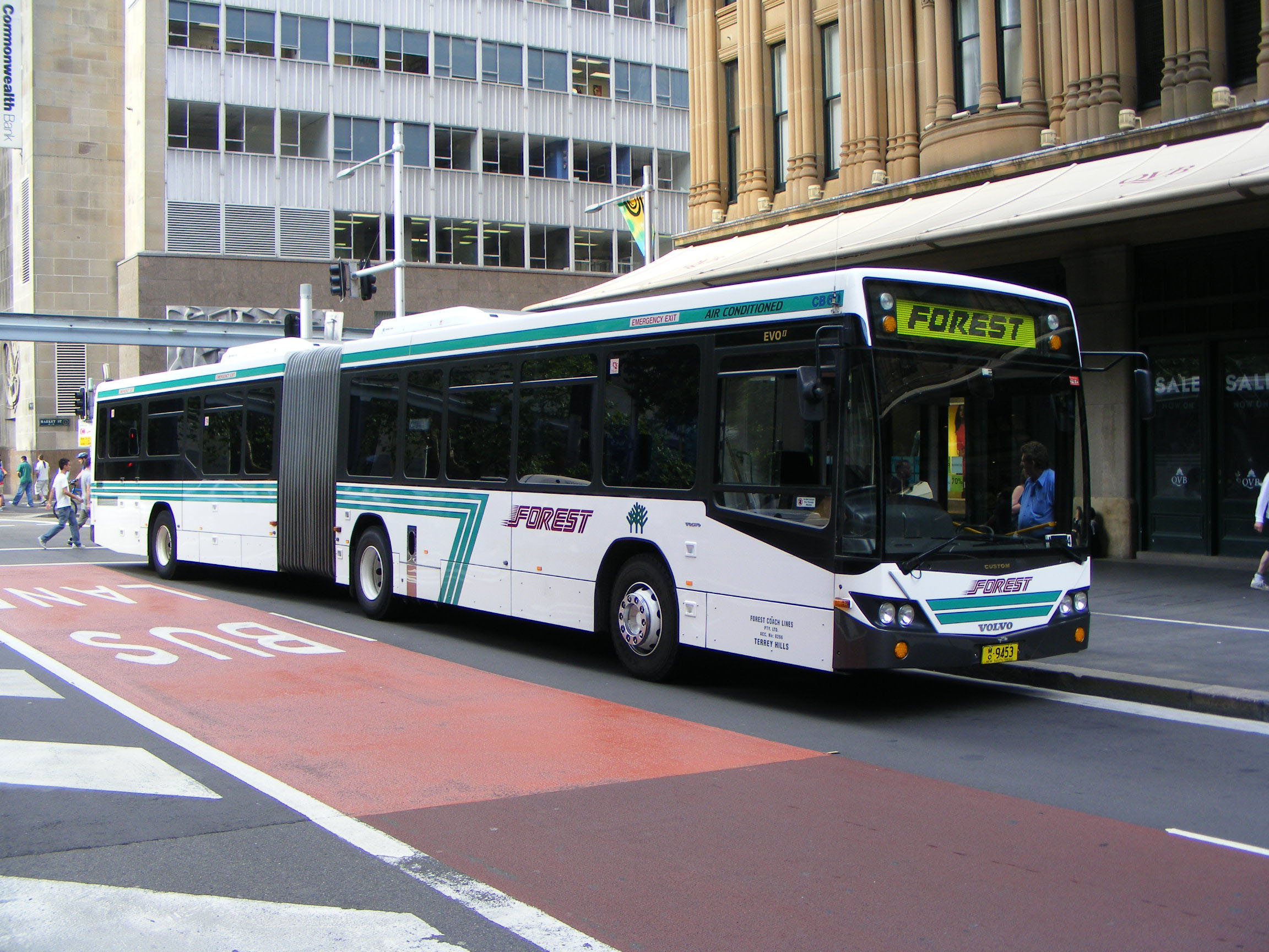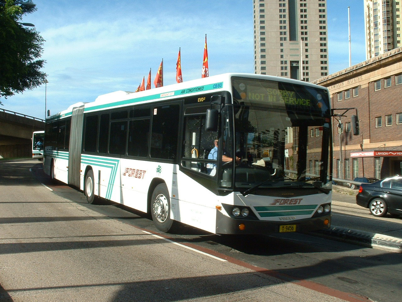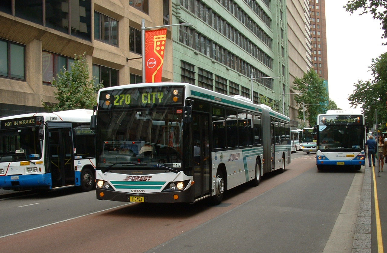 To cope with commuter peak loads and assist on busy school runs Forest built up a fleet of articulated buses, until the doubledeckers appeared on the scene. The majority of the artic fleet comprises sixteen Custom CB60 Evo II bodied Volvo B12BLEA buses built between 2006 and 2010 like 9456 (MO9456), the second delivered, seen in December 2007 rolling off the Harbour Bridge into the city. |