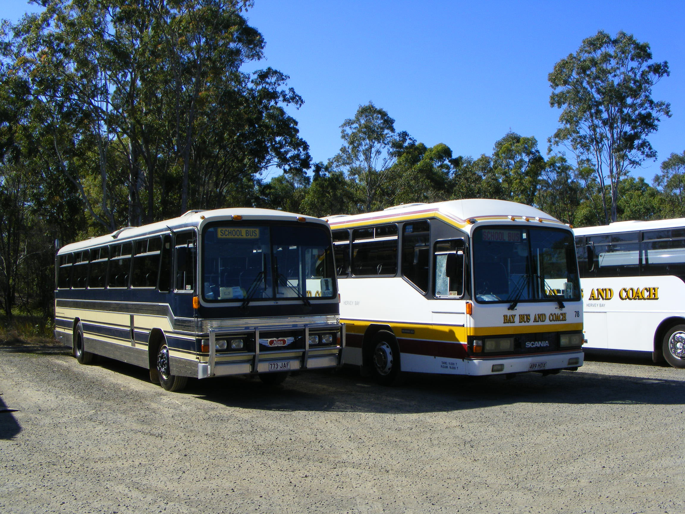 In the Wide Bay Transit depot at Hervey Bay in Bay Bus and Coach livery is 78 (489HDX), a 1990 Custom bodied Scania K93CR new to Hope's Coaches of Gunnedah in New South Wales. The Custom bodied Hino RG197K alongside, Wide Bay Transit 81 (773JAF), another Bay vehicle, is still in the livery of Harris Park Transit, where it was MO7794. This picture was taken in August 2009. |