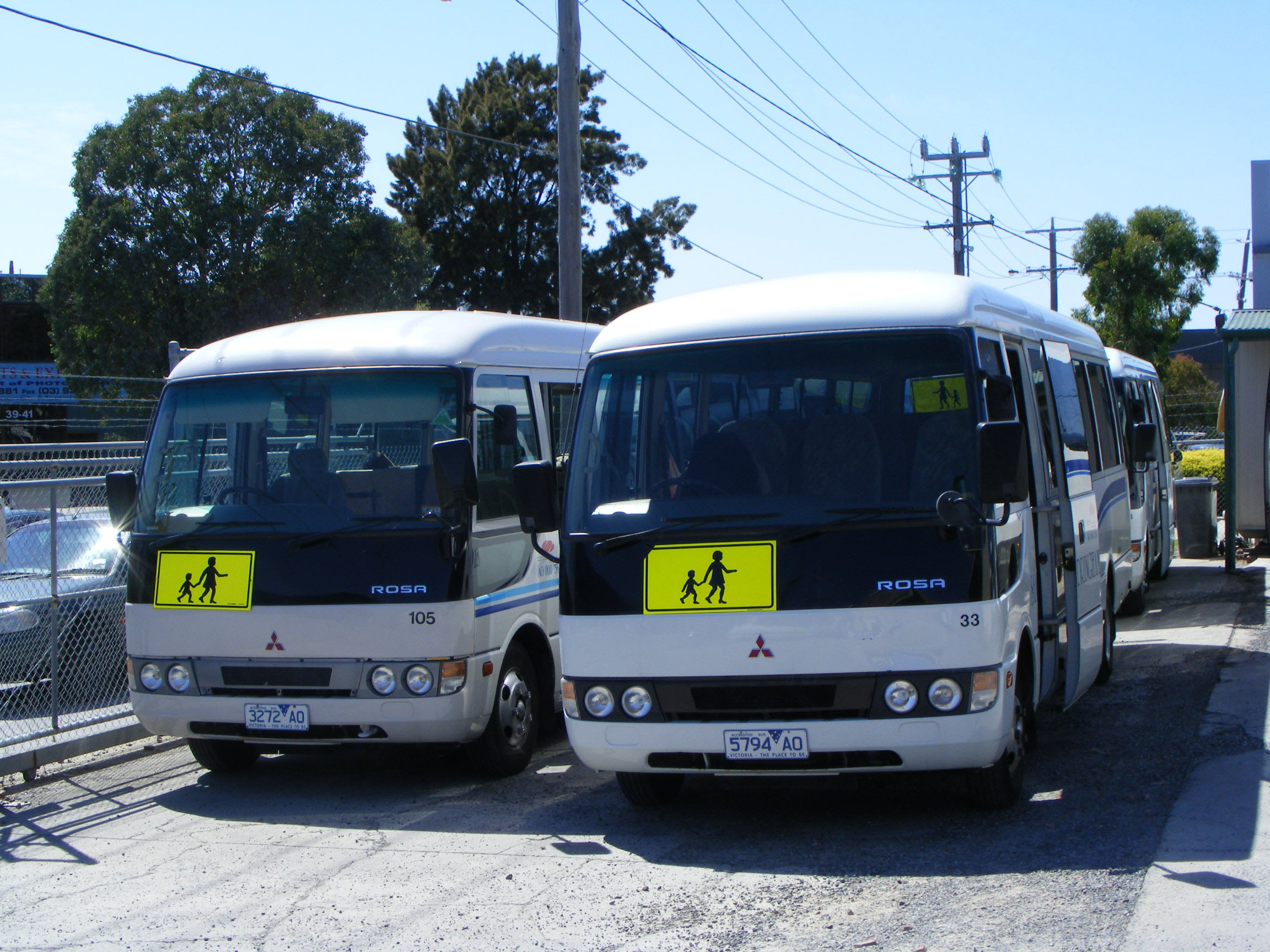 Side by side at the Moorabbin depot was this pair of Mitsubishi Rosas. Both ended up in the Sandringham & Brighton fleet, but 105 (3272AO) on the left, was lettered as a Westernport Roadlines vehicle back in February 2012. The other Rosa, 33 (5794AO), has since been renumbered 133. |