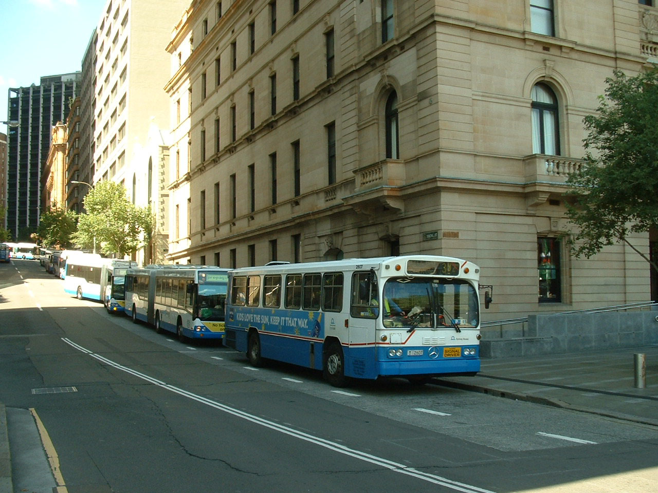 Buses line up at Circular Quay awaiting their time to swoop down on to the bus stops and scoop the passengers for their destination. Here 2337 (MO2337) prepares to leave on the 325 to Watsons Bay.