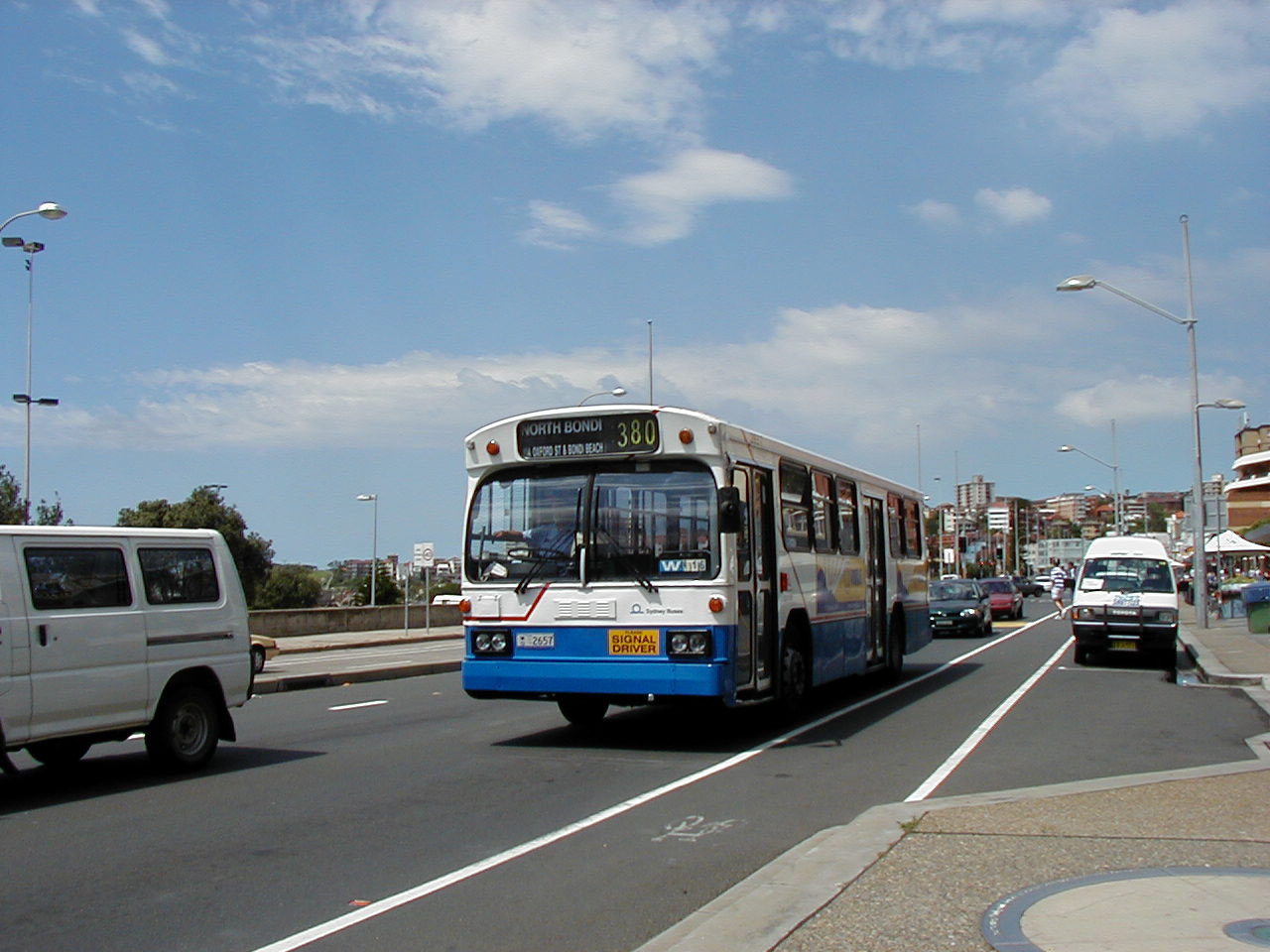 Mercedes 2657 (MO2657) passes along Bondi Beach seafront heading for the North Bondi terminus.