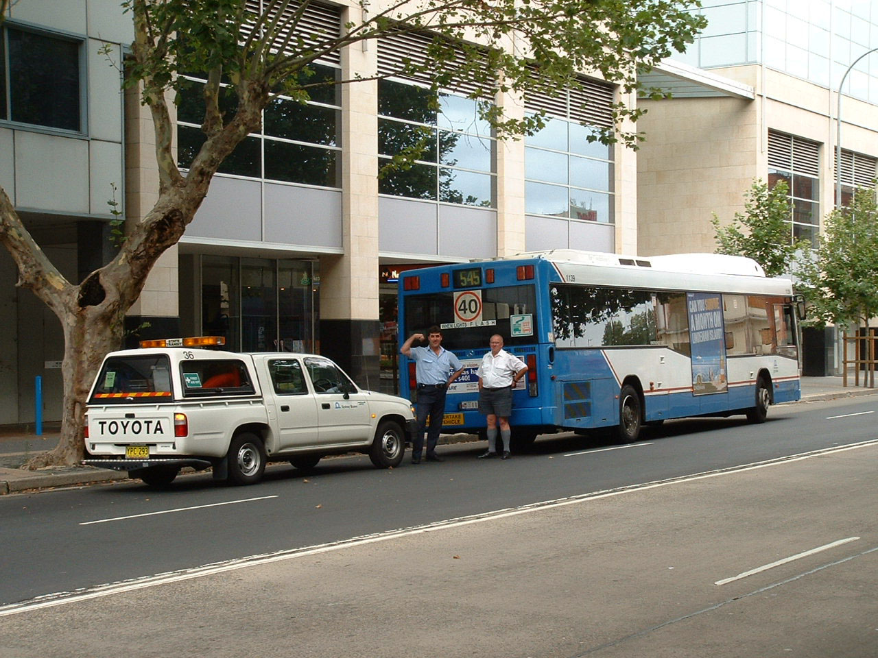 Things do not always run smoothly and Mercedes 1139 (MO1139) is shown here broken down in Parramatta with the Toyota maintenance van in attendance. It looks like a roadside repair is out of the question with the driver and mechanic resigned to waiting for the tow truck.