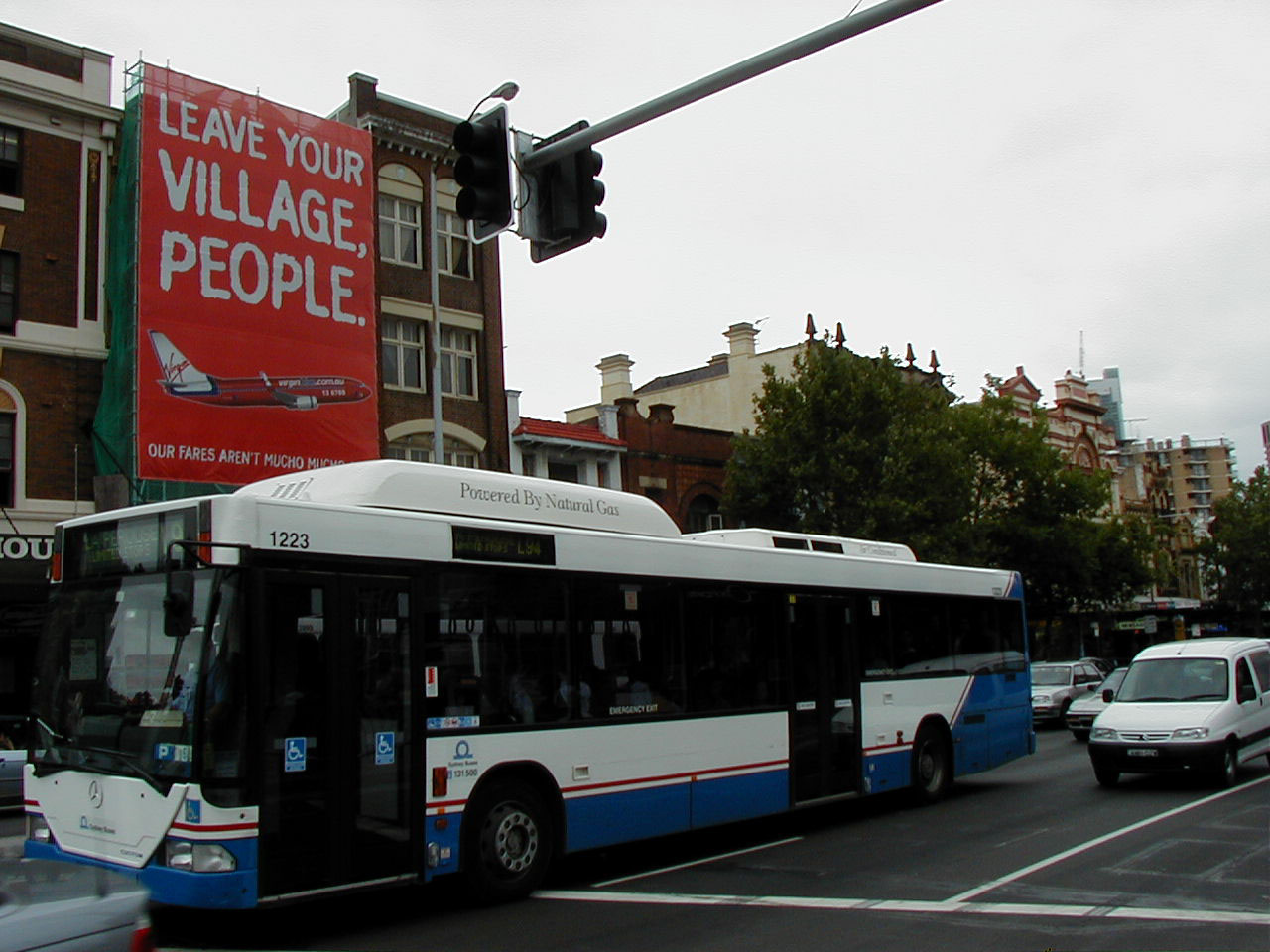 Richard Branson's Virgin Blue was the Australian equivalent of the UK's Easyjet. The tongue in cheek advert behind Custom Citaro 1223 (MO1223) is all the more amusing when you realise it is uniquely placed in Oxford Street in the heart of Sydney's gay community.