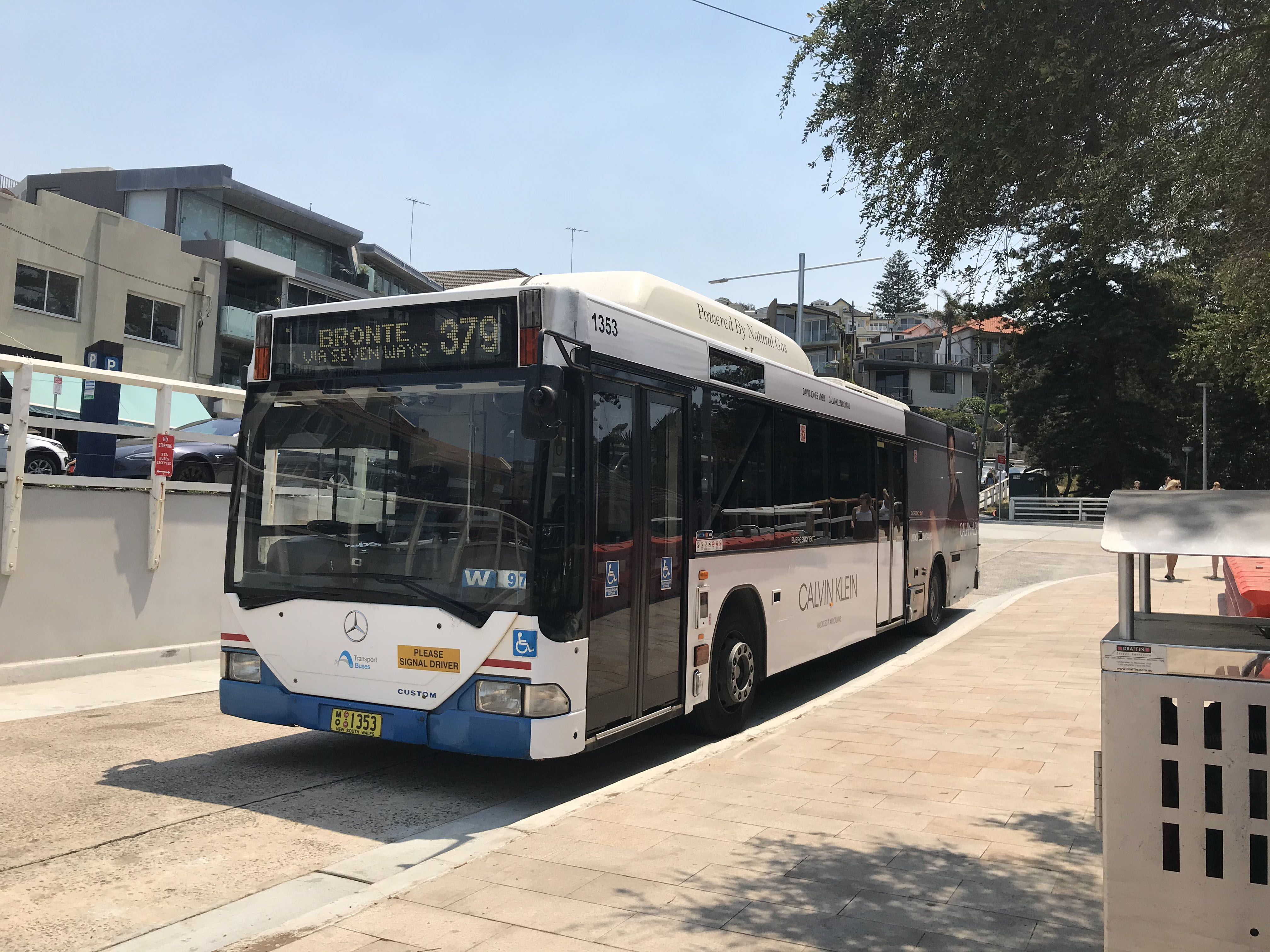 You would probably need to look twice to spot that Mercedes 1353 (MO1353) is actually advertising anything, particularly from this December 2019 front view at Bronte Beach. Calvin Klein has paid the bill!