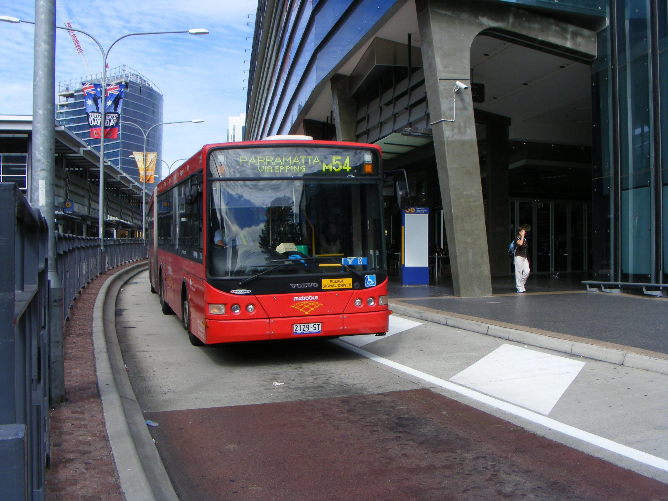 Several more routes became Metrobus branded beyond the initial five. Some are operated by contractors other than State Transit. Out in Parramatta 2129 (2129ST) arrives on the M54 in April 2012.