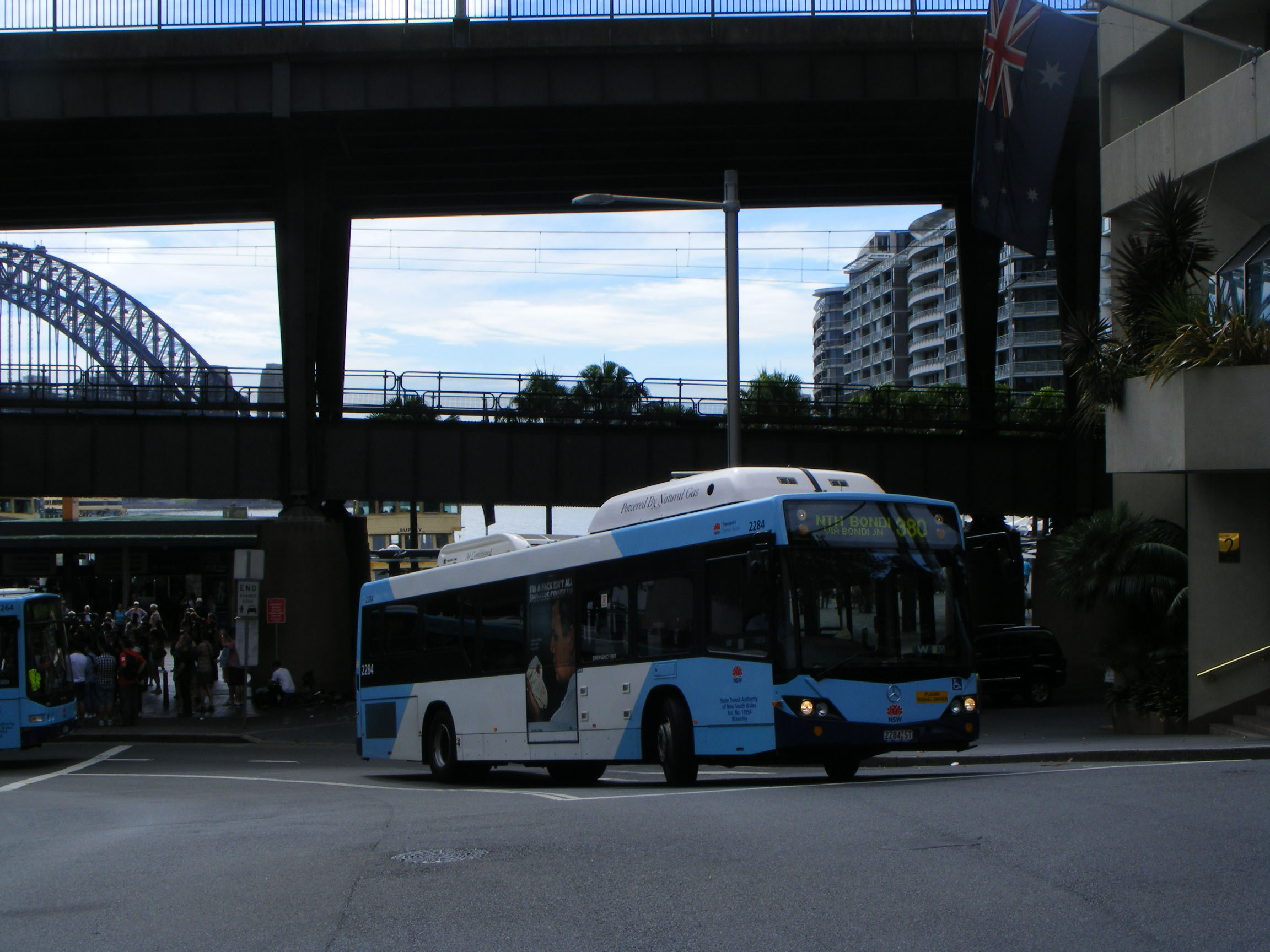 Seen two days before, sister vehicle 2284 (2284ST) leaves Circular Quay headed for the eastern suburn=bs on the 380.