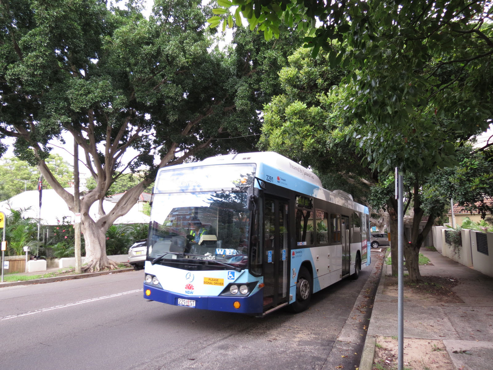 Threading its way along route 360 two years later is Mercedes 2291 (2291ST). Oddly it has a non standard application of the TfNSW livery with a white front dash, possibly received after sustaining accident damage.