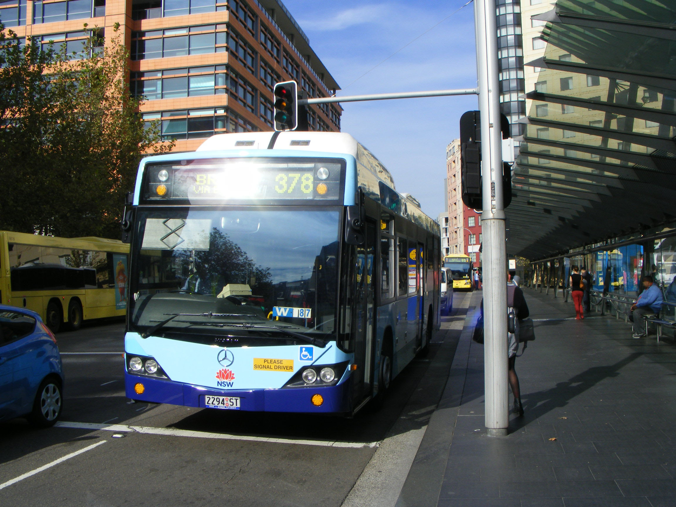Later deliveries of the Mercedes O500LE fleet fell fowl of the new TfNSW livery edict so 2294 (2294ST) is seen in those colours in the CBD and headed fro Bronte on the 378 in April 2012.