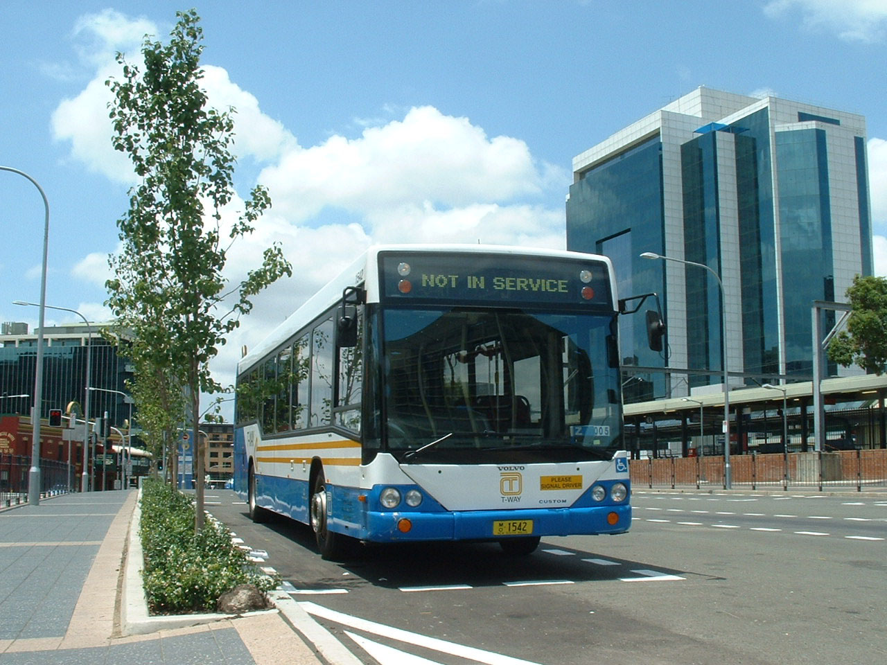 The West Sydney T-Way fleet was renewed with Custom B12BLEs replacing the Custom Citaro style Mercedes. Volvo B12BLE 1536 (MO1536) is seen on the new stands in Parramatta in August 2005.