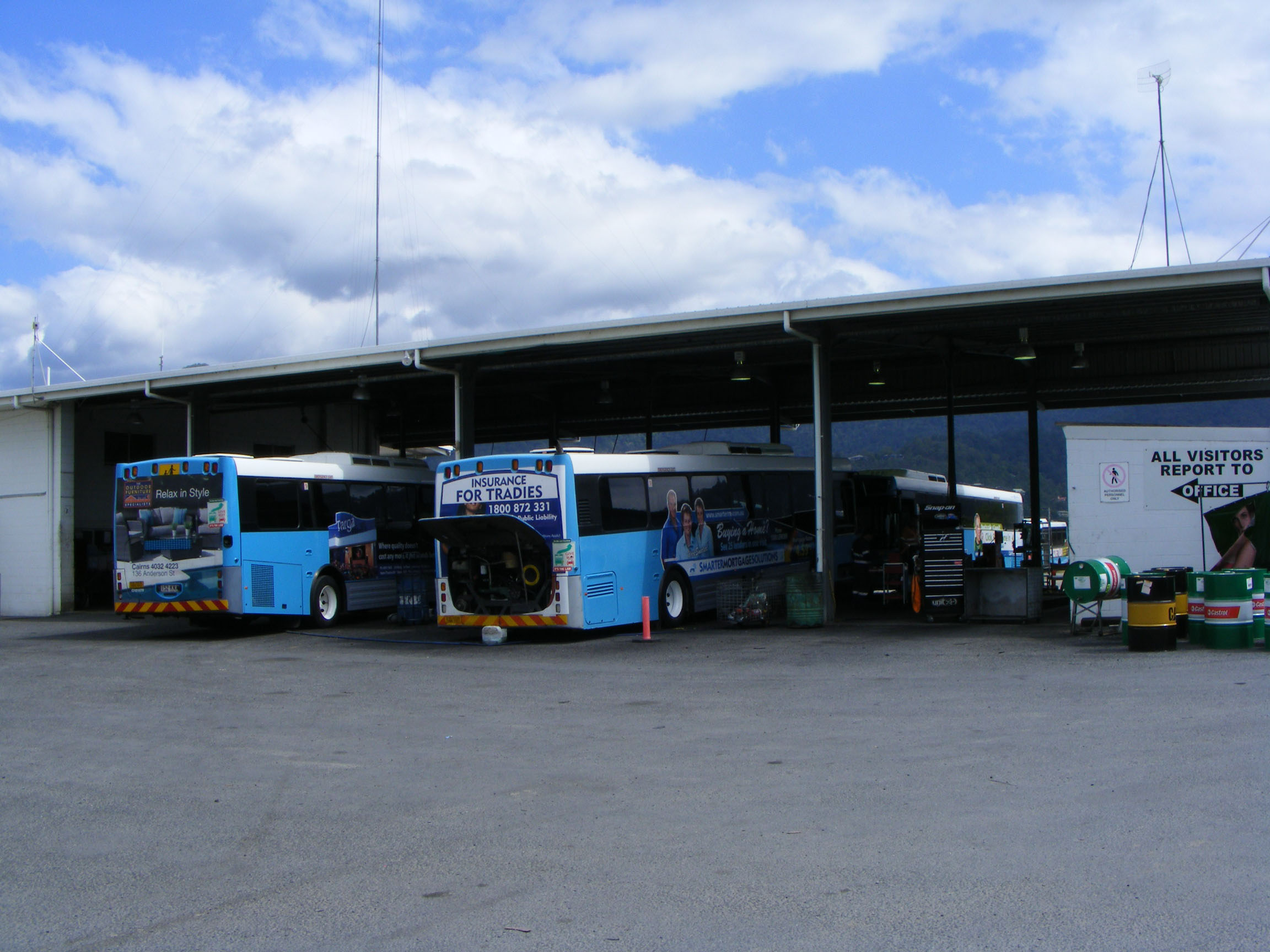 The Cairns Sunbus depot with two Bustech models receiving attention. The bus on the left is numerically the first MDi 2600 (157KNA) delivered in 2008. The bus alongside is believed to be one of the Volvo B12BLE buses delivered around 2004.