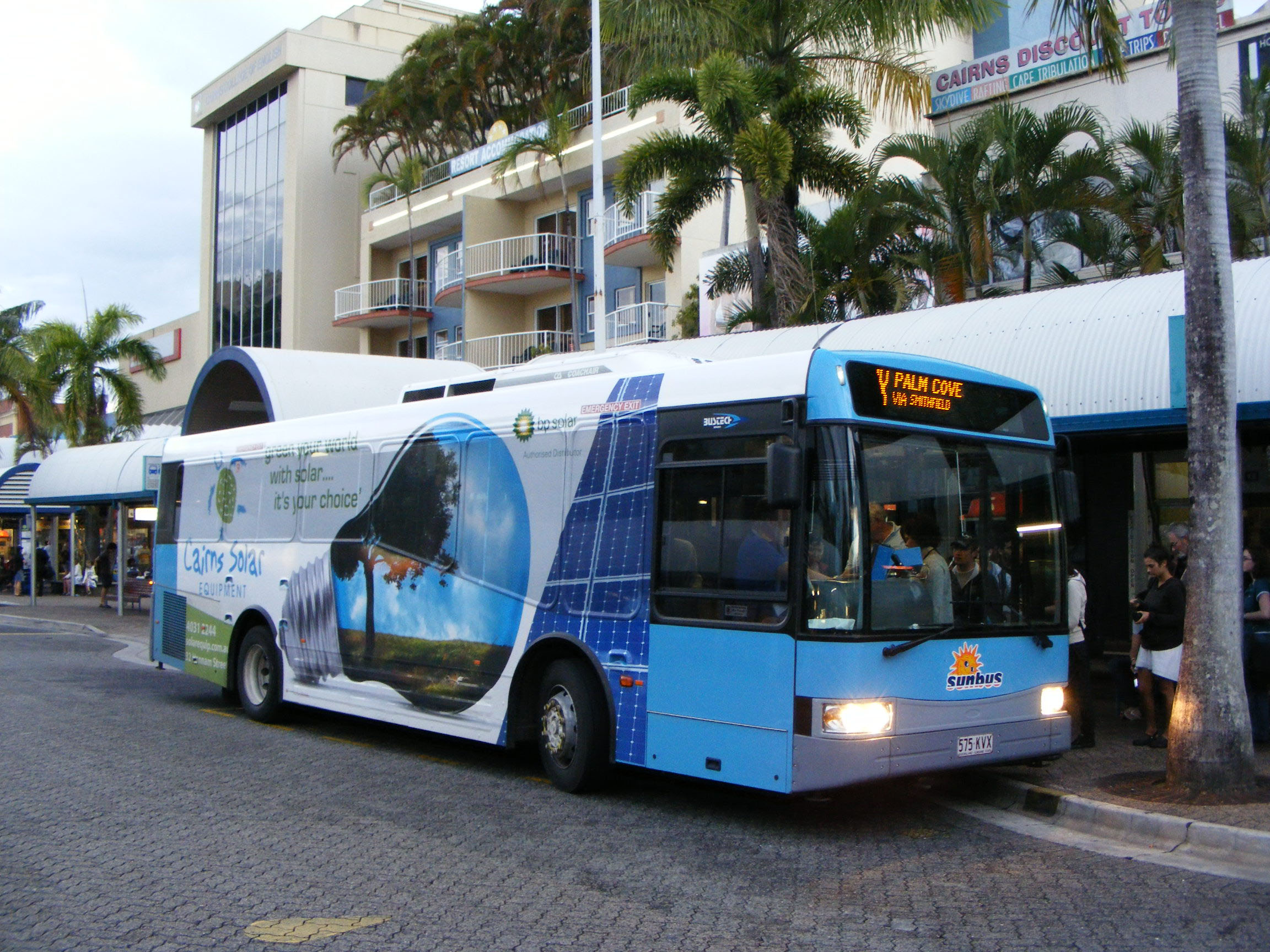 The bus is seen later in the day at the city terminal about to head up the coast to Palm Cove.