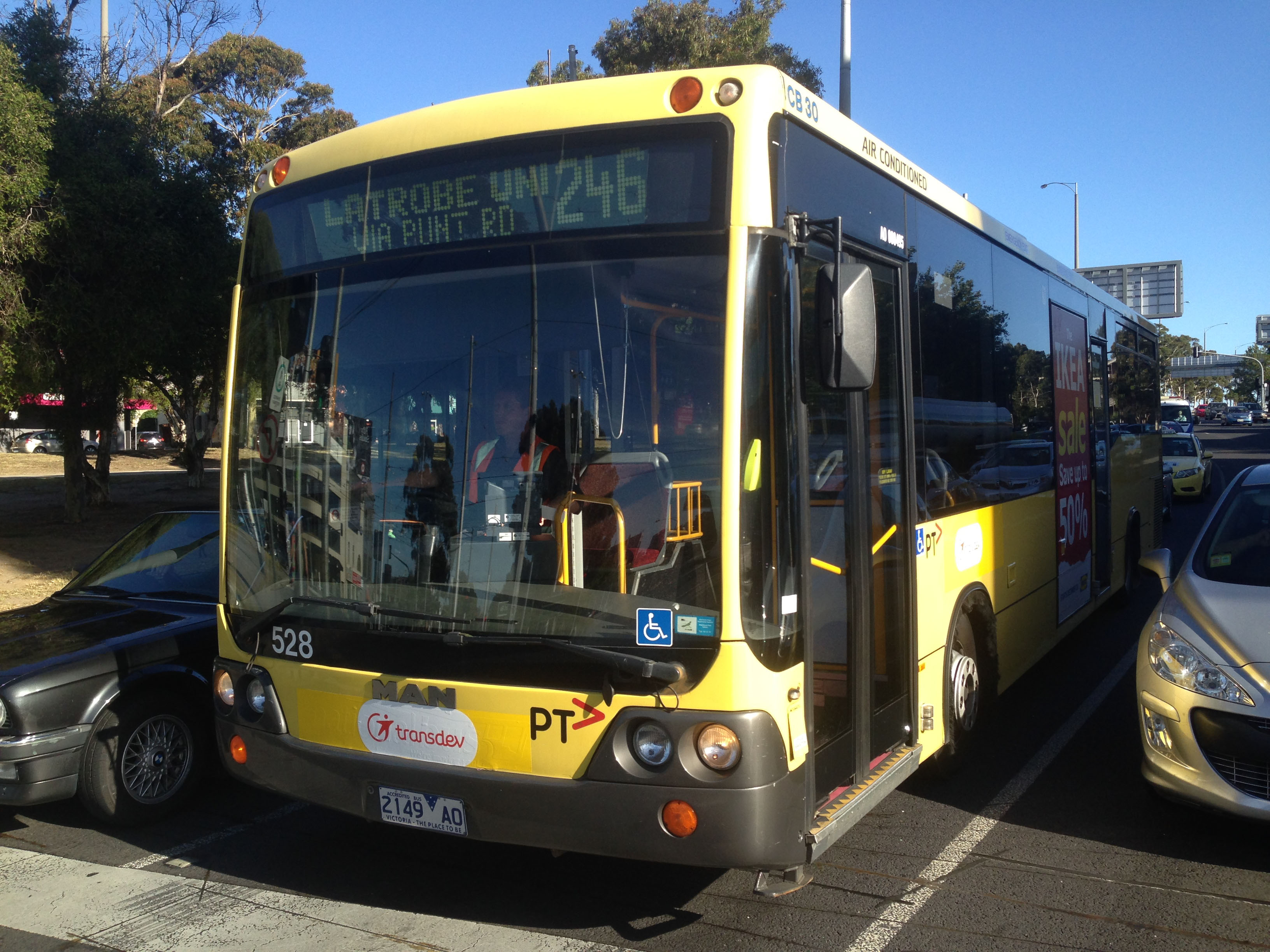 Seen at St Kilda Junction six days later is sister vehicle 528 (2149AO), one of three delivered to National Bus in 2003. The bus is seen on one of the 246 journeys that used to be extended beyond Clifton Hill to Latrobe Uni. |