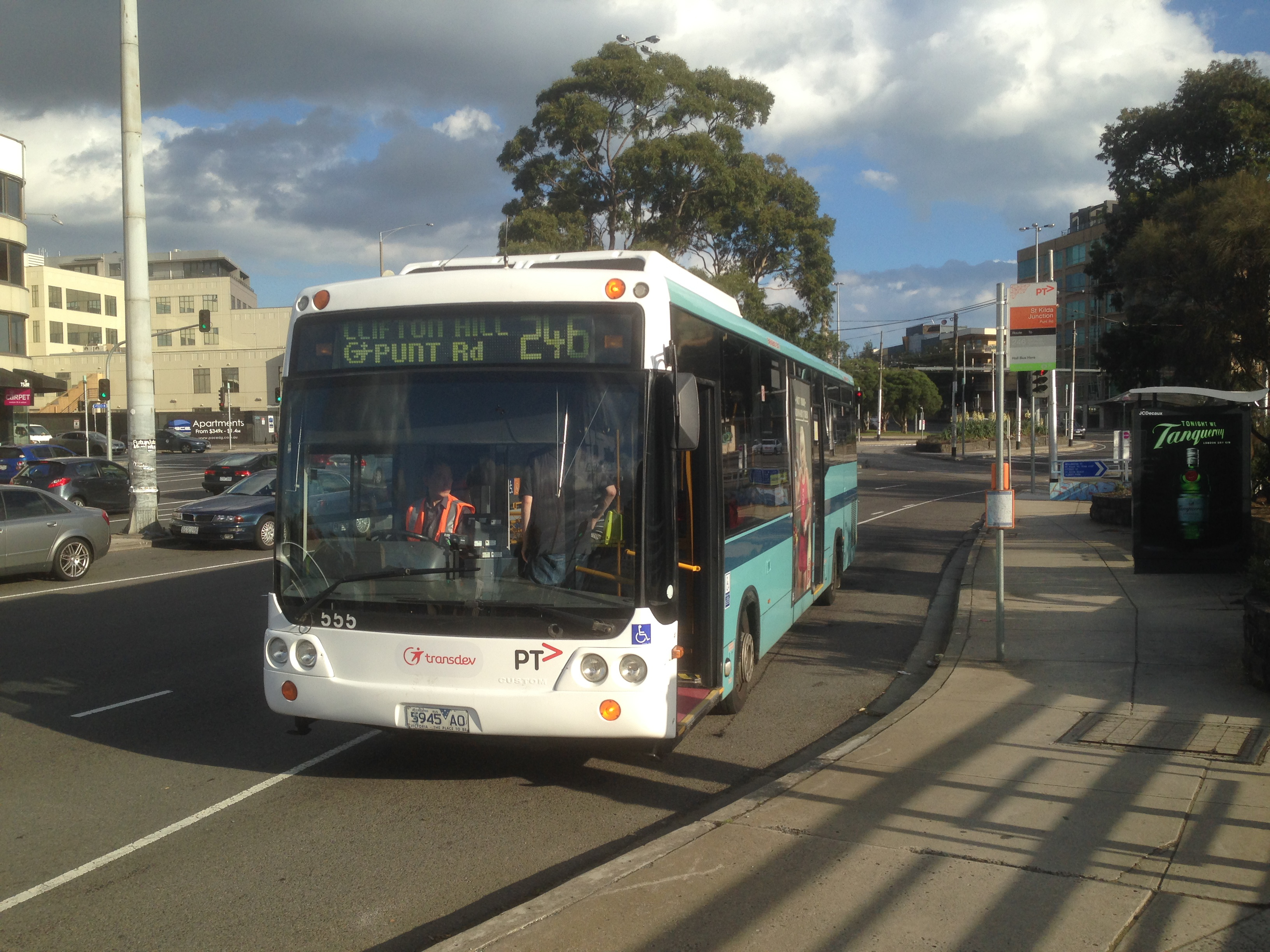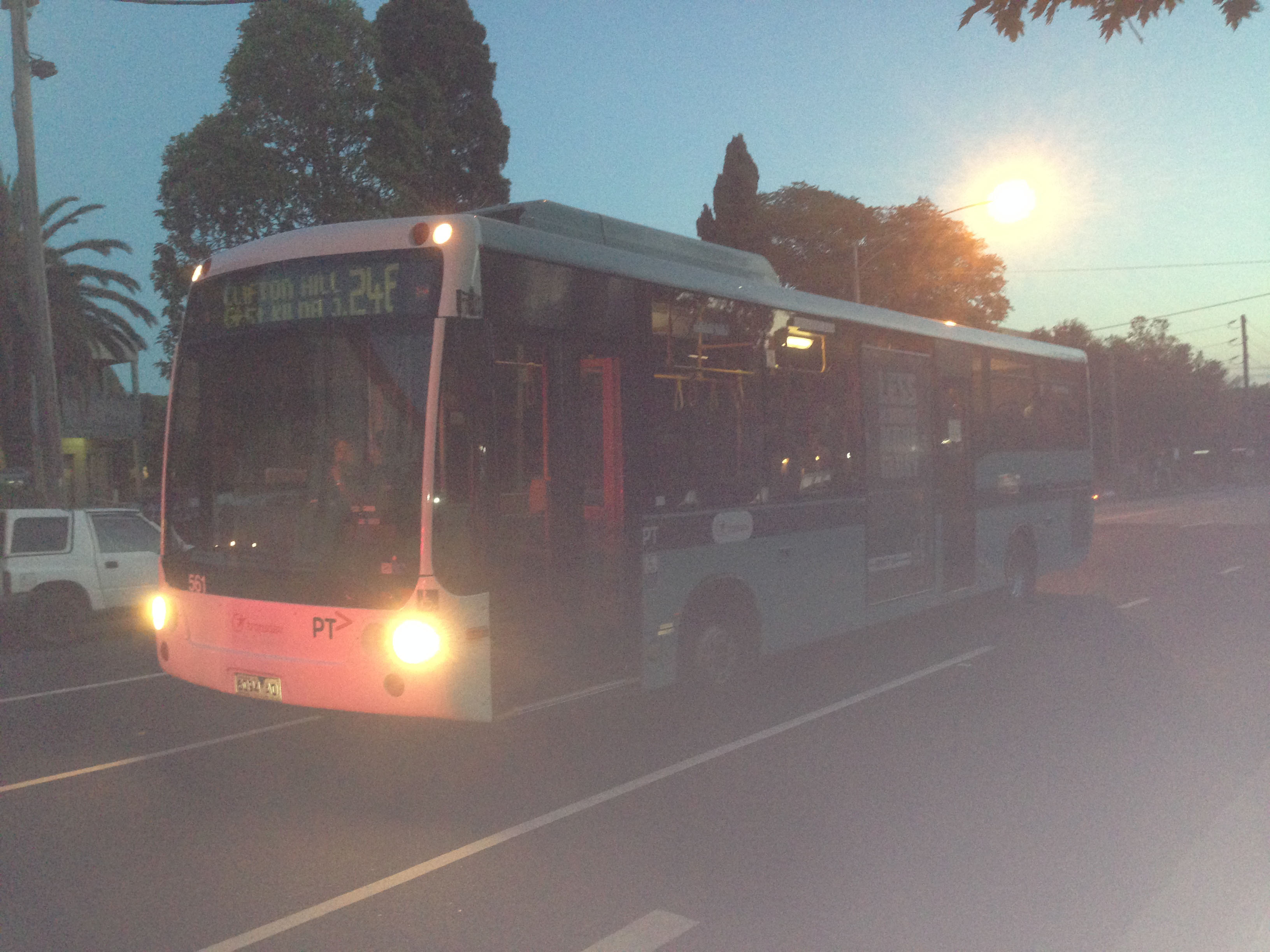With St Kilda Junction behind it in January 2014 nine year old Custom CB30 bodied MAN 14.220 555 (5945AO) has an interesting take on Transdev livery. Whether it needed some frontal repairs is not known but the front has been given Transdev livery, rather whilst the rest of the bus is in National Bus blue. |