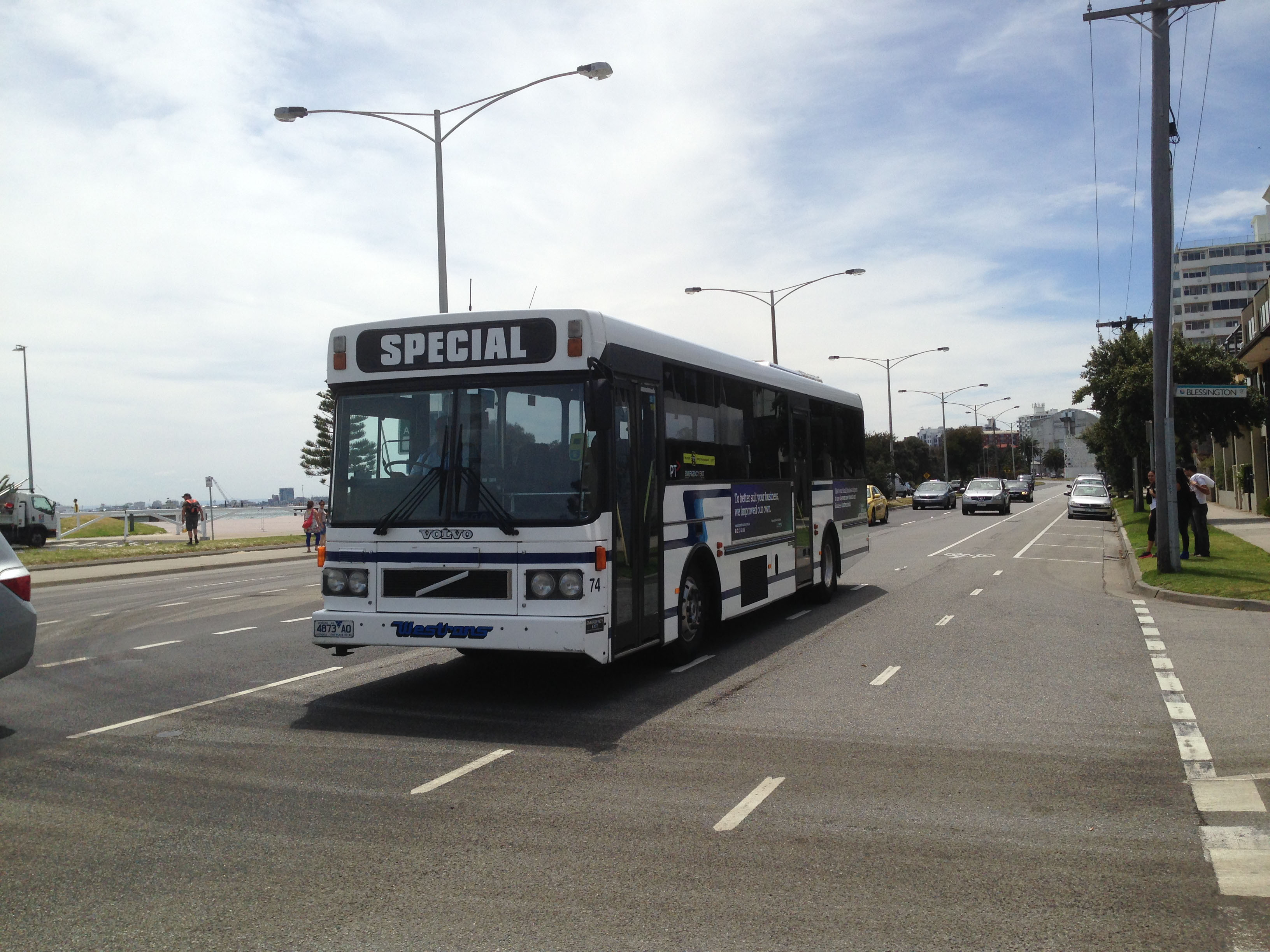 Westrans has adopted the PTV livery across all its operations in Victoria, but in November 2013 Volgren bodied Volvo B10M 74 (4873AO) was still in Westrans Werribee blue livery. The 1997 Volvo has survived in blue by being part of the Charter bus fleet.