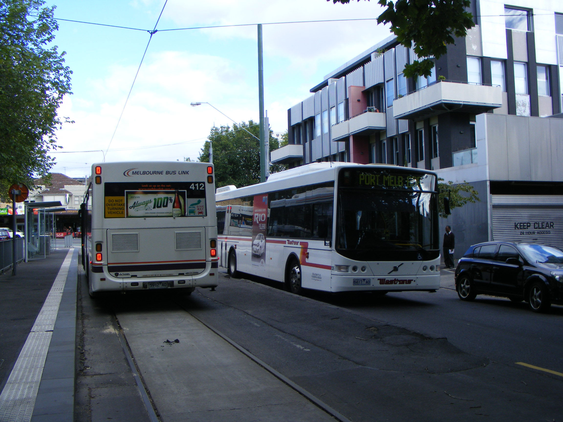 Park Street 2013 and 412 (5912AO), the first of Melbourne Bus Link's Scania K230UB buses is waiting deployment on the Grand Prix tram replacement services. Meanwhile Westrans' Volgren CR228L bodied Volvo B7RLE, 125 (8417AO), soldiers on as usual on the 606 between Elsternwick and Port Melbourne. |