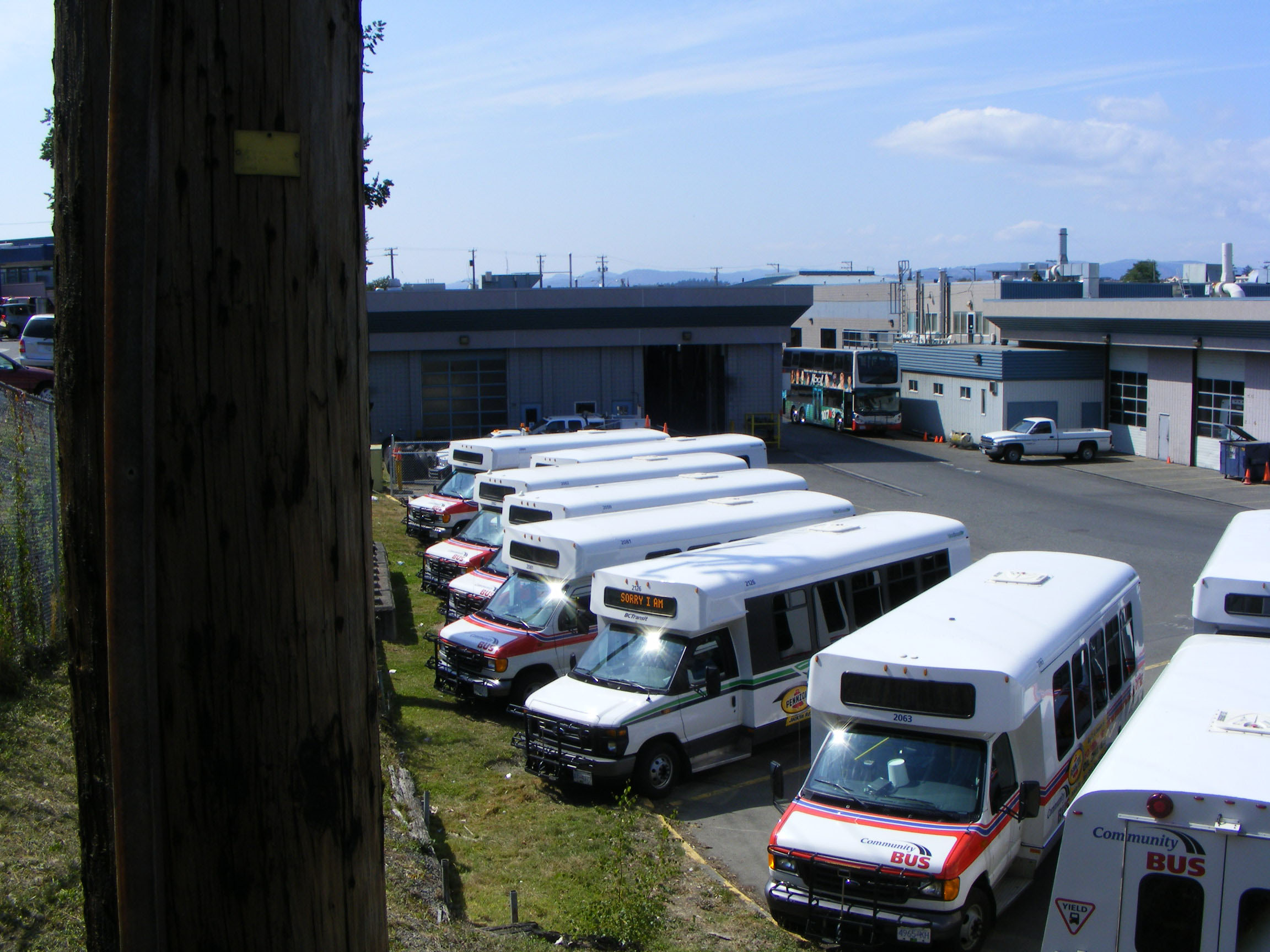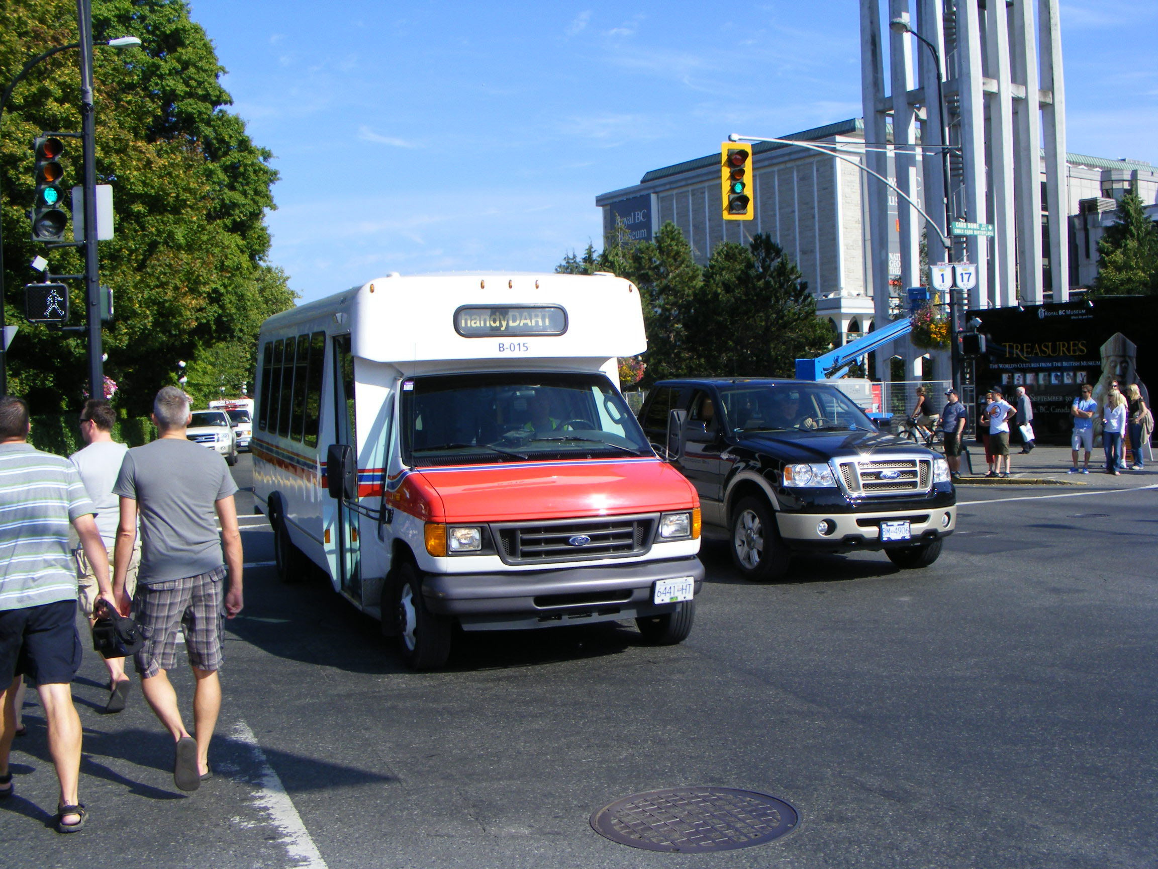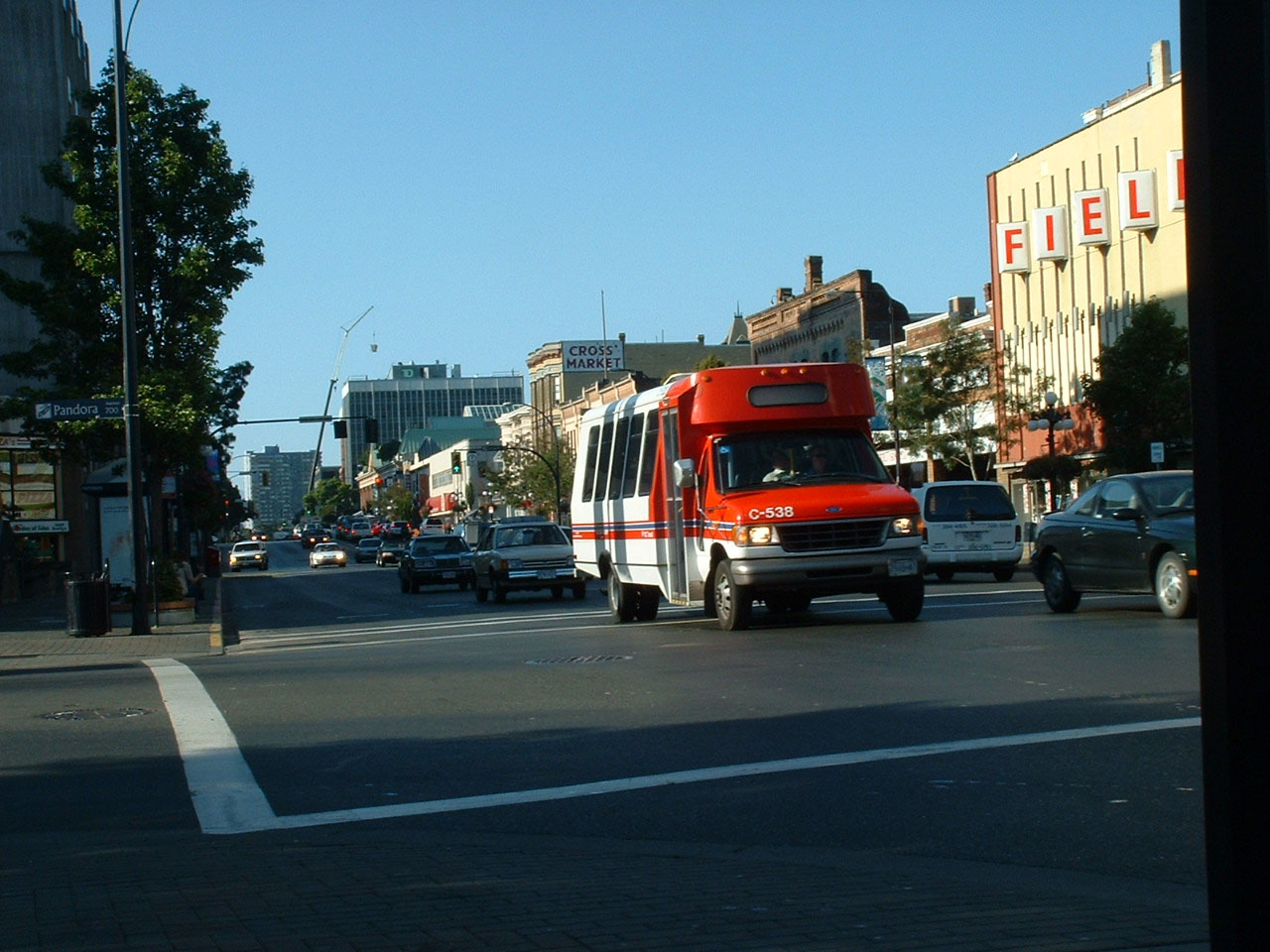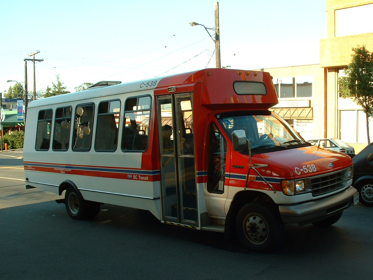 Across BC Transit and Coast Mountain Bus paratransit services are branded HandyDART and Ford E450 models were the order of the day when C538 was seen downtown in Victoria in August 2004. CBB Polaris III bodies were preferred, but the Fords were later ousted by Chevrolet 4500 minibuses with Arboc SOM28D coachwork.