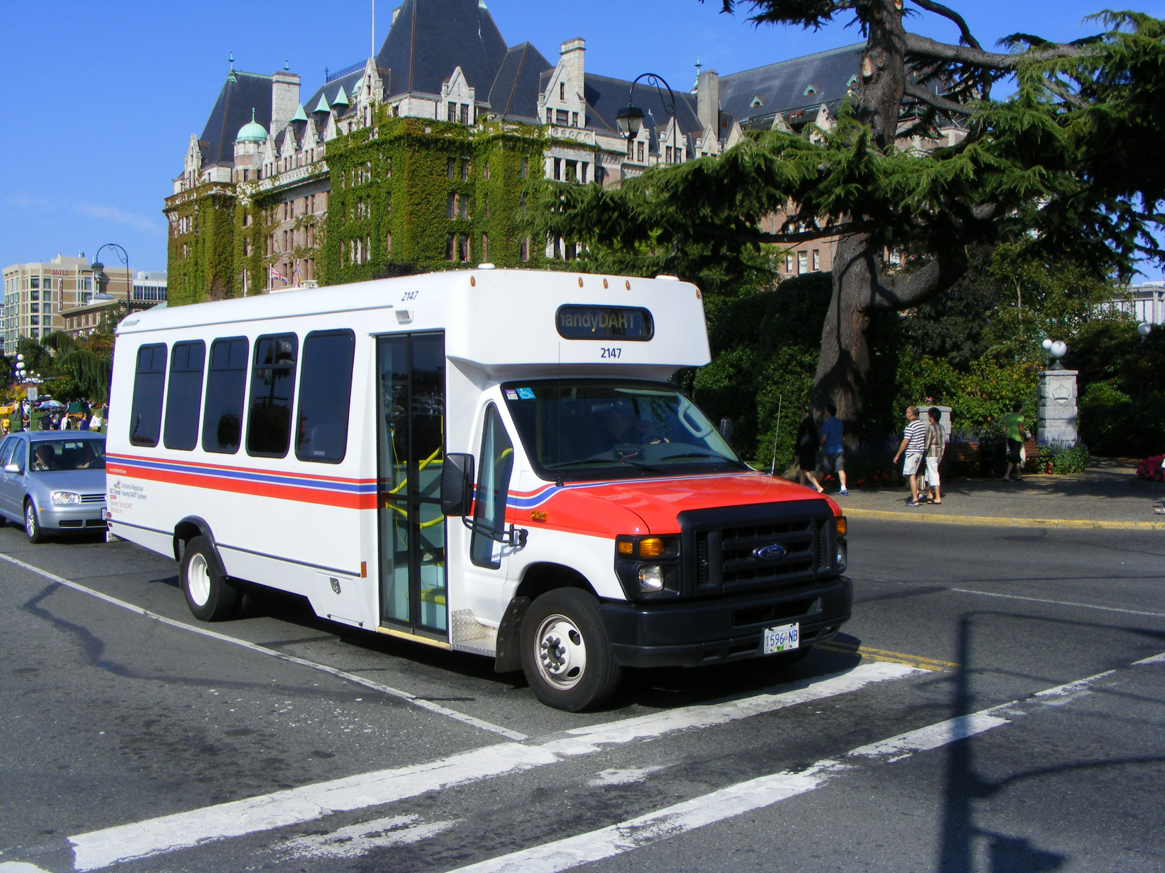 Ford E450 2147 has no hint of "Community Bus" branding and has "HandyDART" on its destination blind as it passes the majestic Empress Hotel on Victoria's Harbour frontage in August 2009.