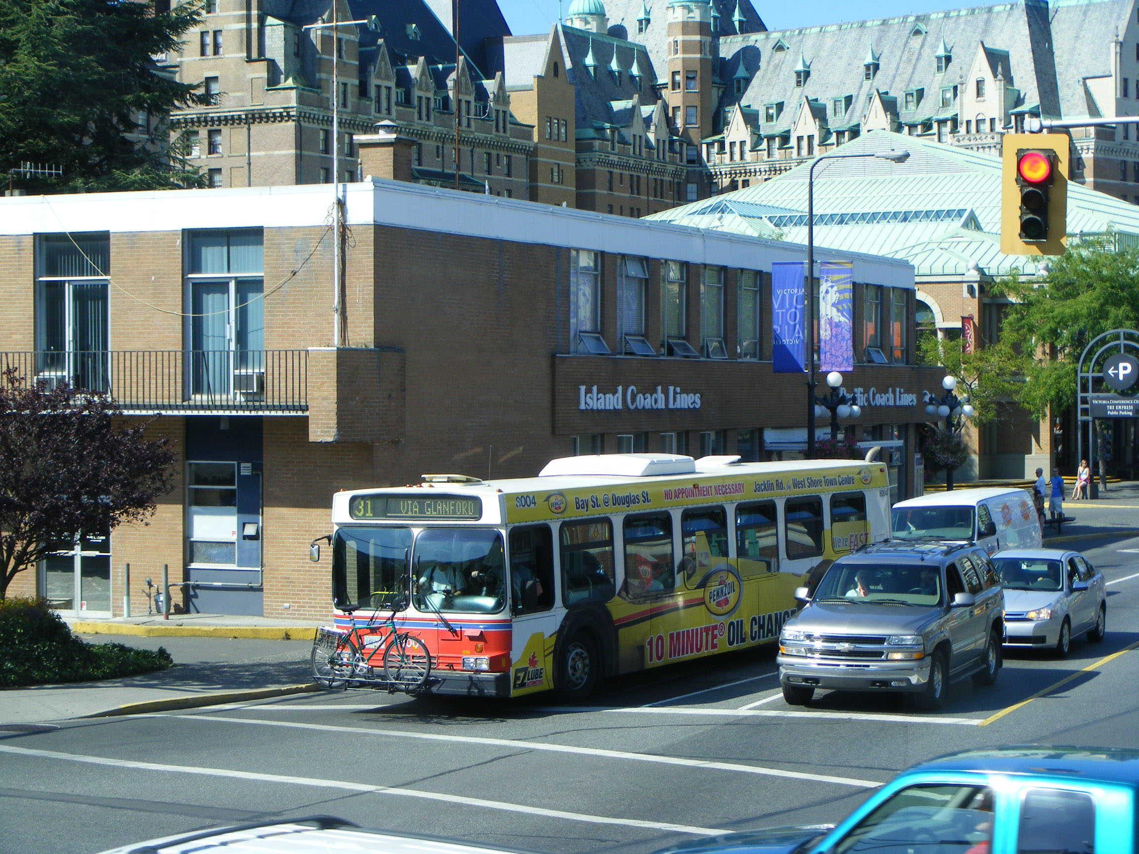 Outside the Victoria Coach Terminal in 2009, New Flyer 8004 is advertising 10-minute oil changes.