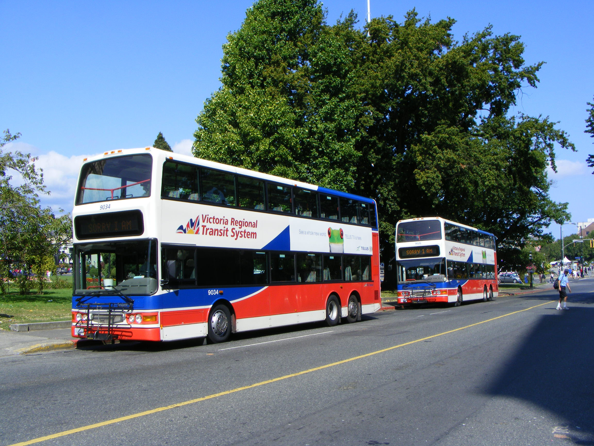 Two Tridents wait at the Government Street stand, by the harbour in Victoria, in August 2009. In the lead is 9034 with 9026 bringing up the rear. Both buses are near identical, still retaining the original livery, the same frog ad for Telus TV and even the same "SORRY I AM" destination displays.
