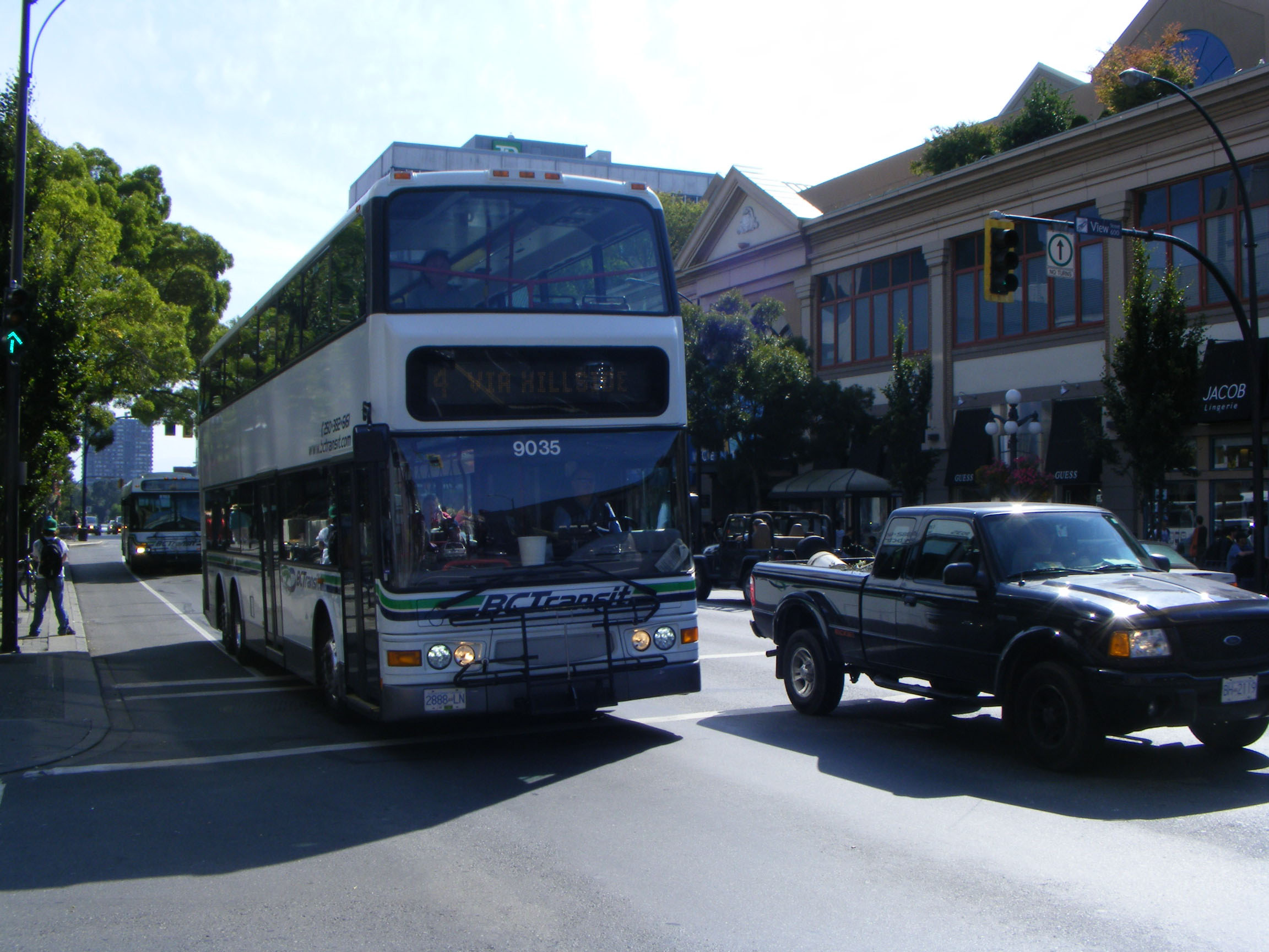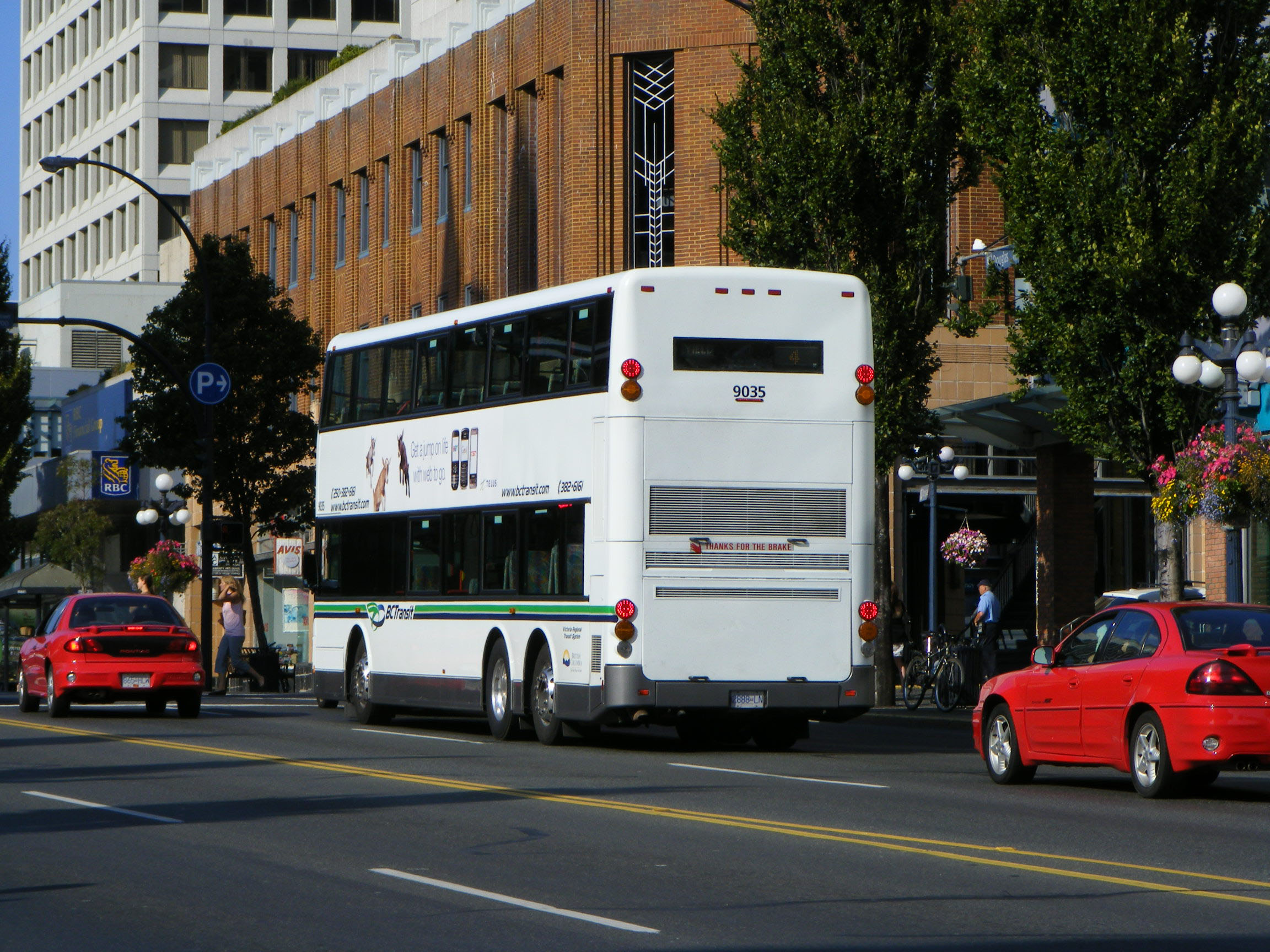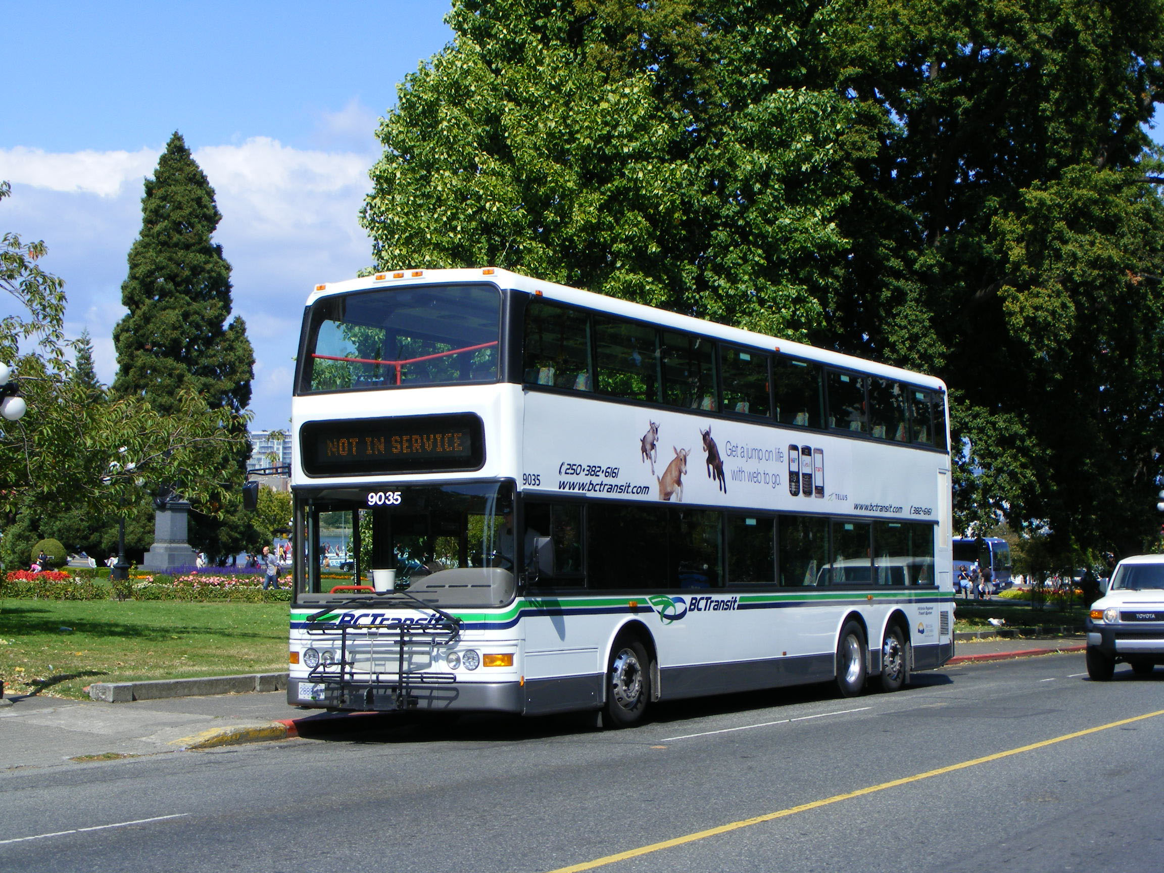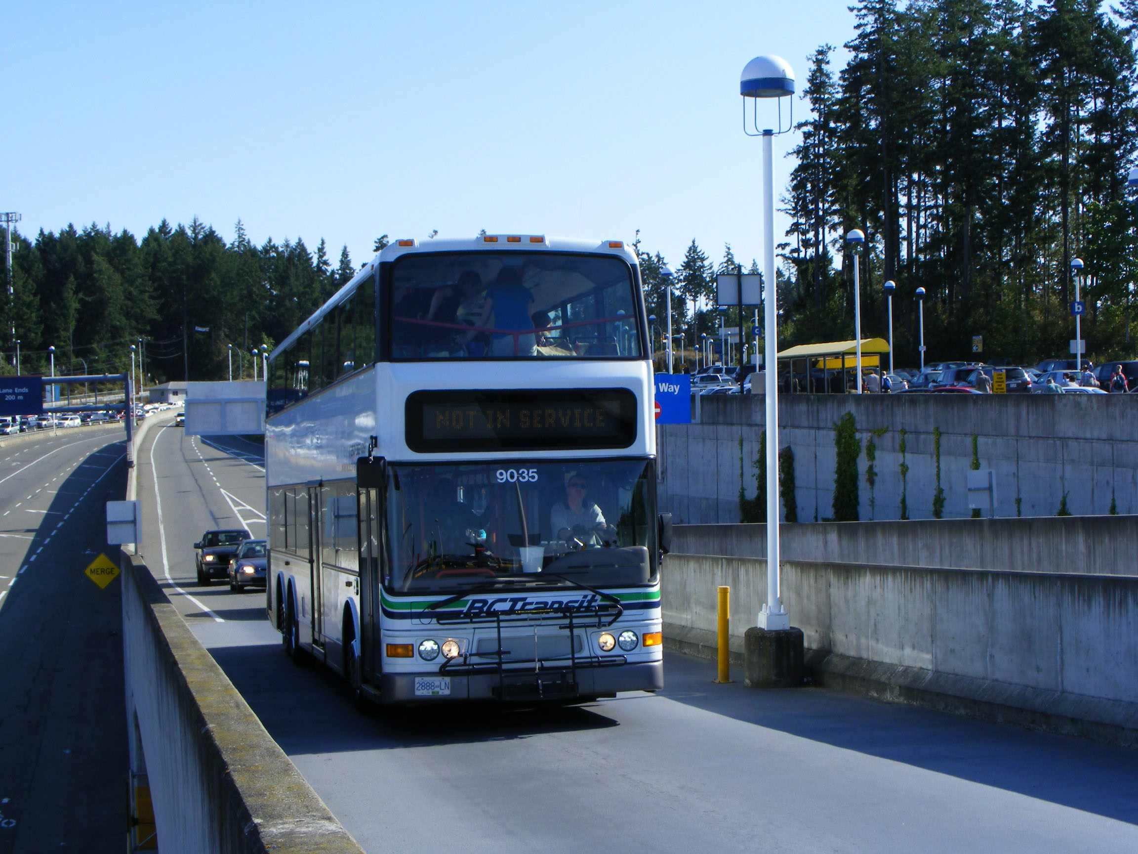 A day later 9035 is seen about to climb the ramp at Swartz Bay Ferry Terminal. The bus has a layover at the Terminal and the driver from Victoria has already set the blind to "NOT IN SERVICE".