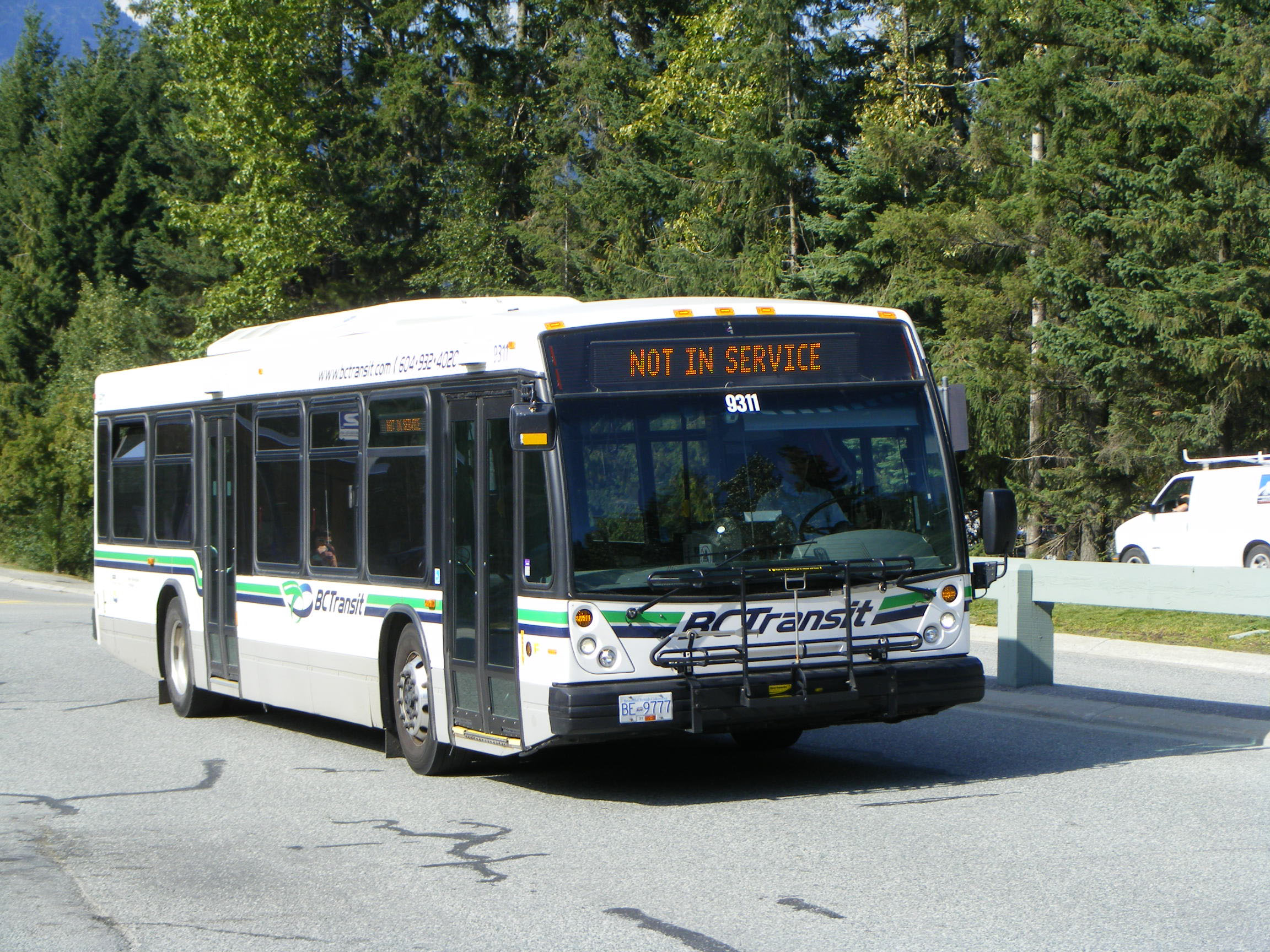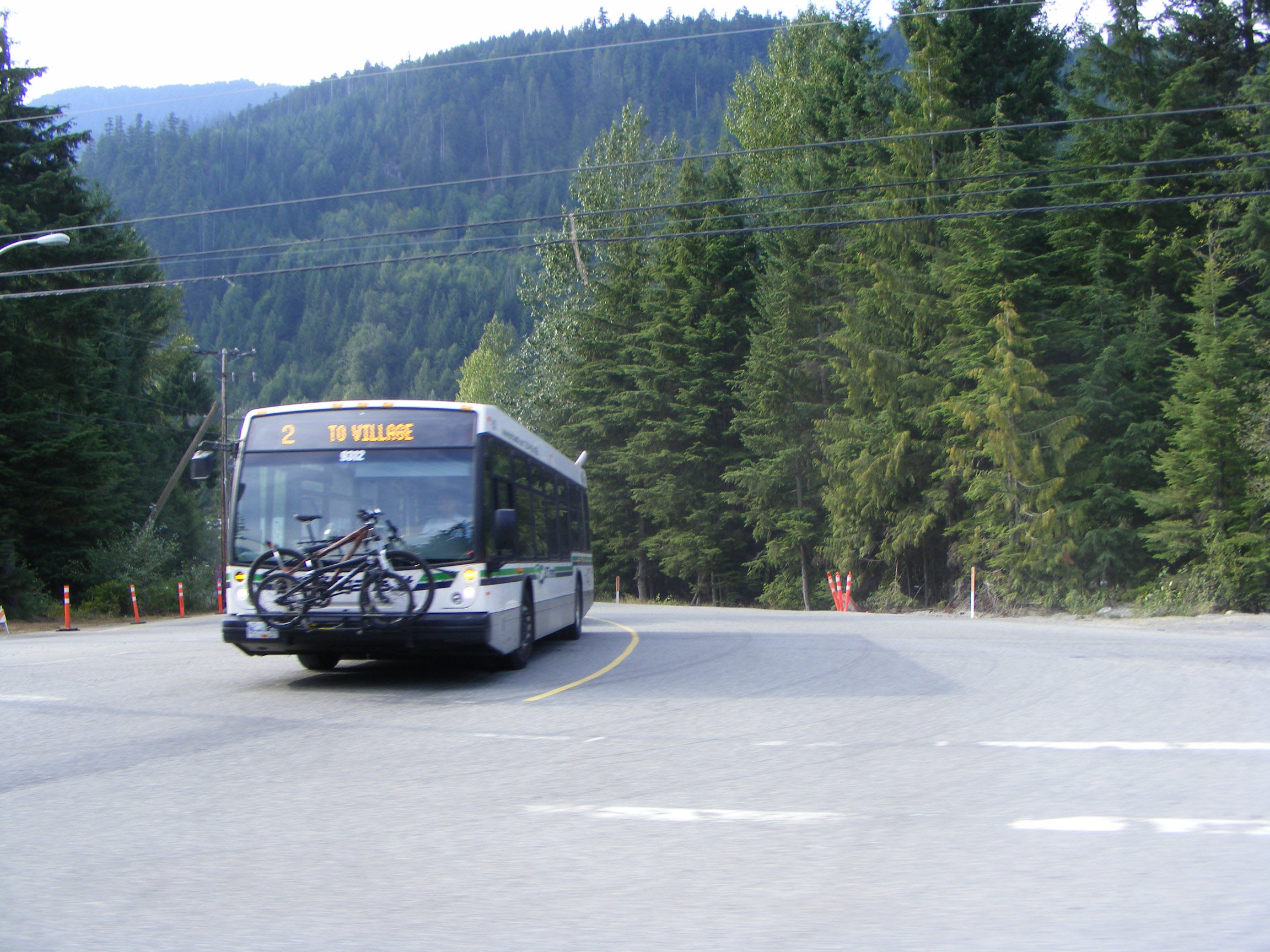 Managing two bikes NovaBus 9312 heads for the Ski Village. The bikes might be for use on the ski runs as, in the absence of snow in the summer season, some of the ski runs are given over to bikes.