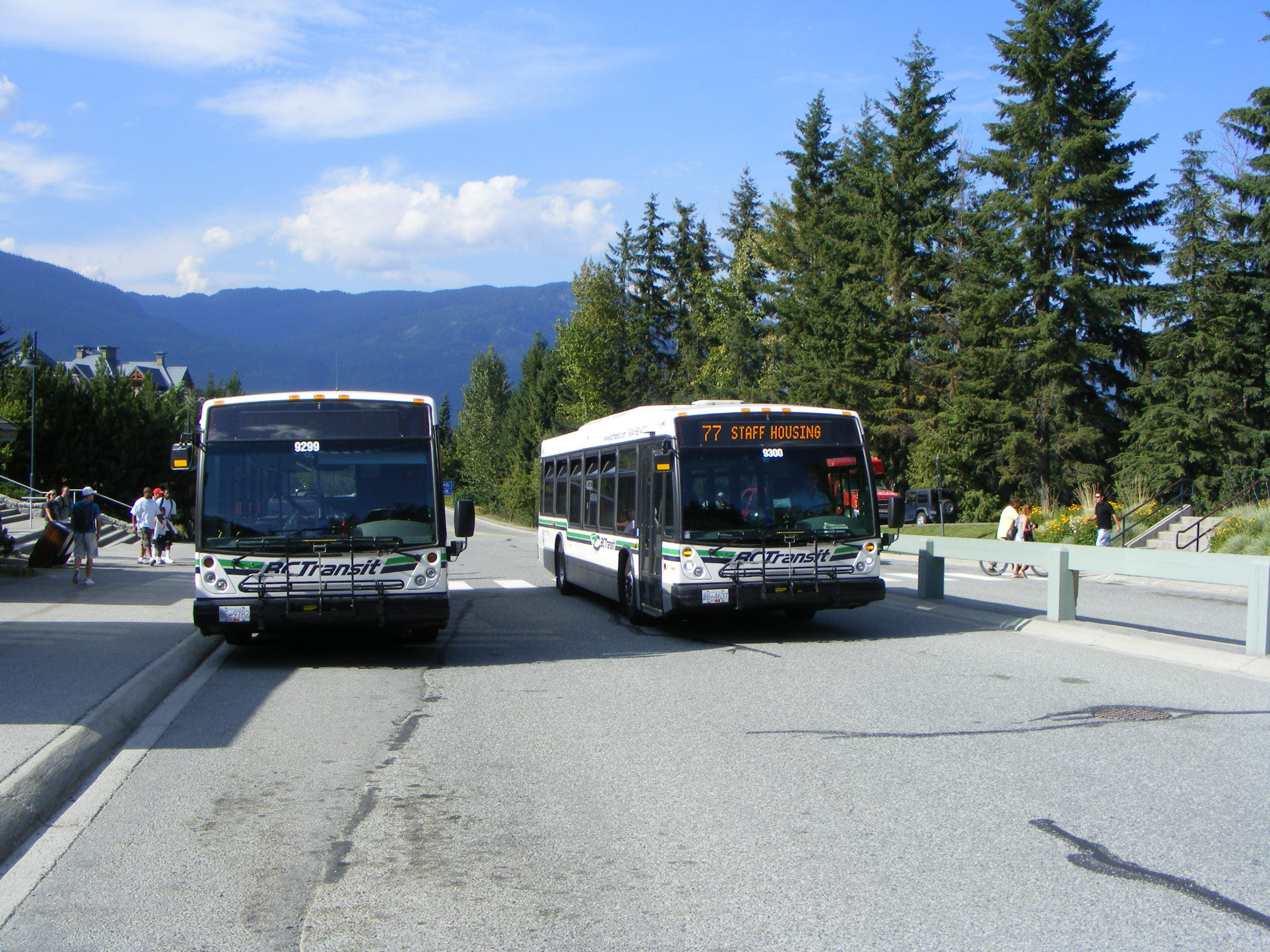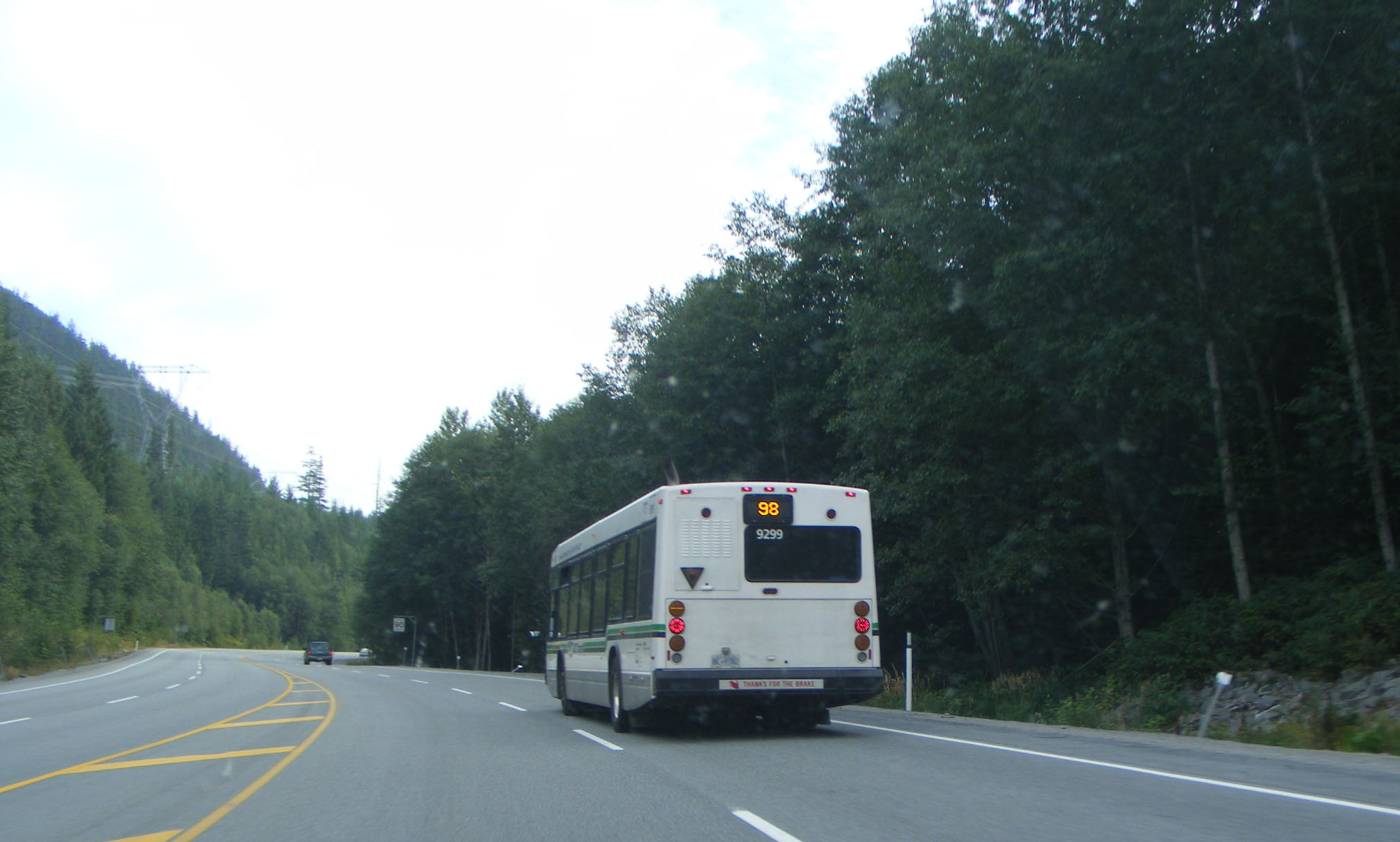The road from Vancouver north to Whistler has stunning scenery with lakes, mountains and the sea. It is known as the Sea-to-Sky Highway. Work was hurriedly being completed to upgrade the Highway to dual carriageway throughout in readiness for the Winter Olympics. NovaBus 9299 was heading south down the Highway to Squamish.