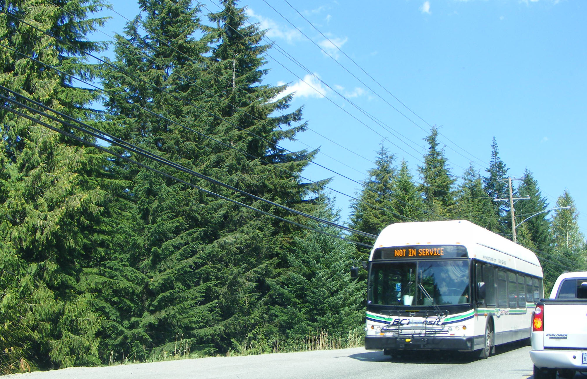 Also seen on the Sea-to-Sky Highway was this yet to be numbered Hydrogen fuel cell New Flyer H40LFR. A fleet of twenty of these was being readied for the Olympics. Enviro500s from Victoria were also drafted in to cope with the Olympic crowds in the winter. In late 2014 the decision to dispose of the fuel cell buses was taken due to their high operating costs. Converting them to diesel power had been an alternative option, but 1000 to 1019 left the fleet.