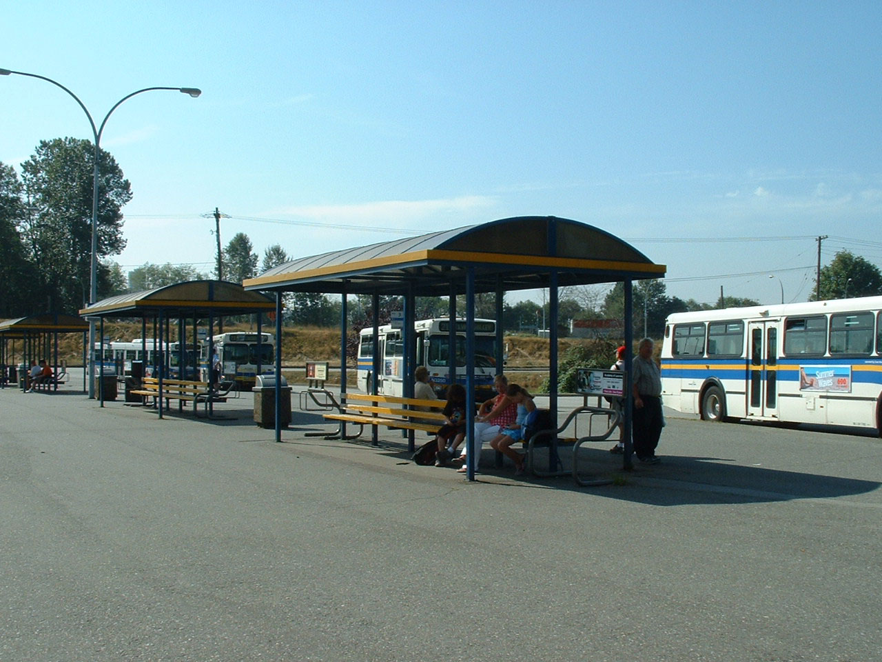 Several D40HFs at Phibbs Exchange plus a New Flyer D40LF at the rear. Phibbs Exchange is on the north shore of Vancouver Harbour, near the Ironworkers Memorial Bridge crossing. The exchange is in a relatively remote location and is empty more than busy, but services are timed to coincide affording connections across the north shore as well as across the bridge to the city.