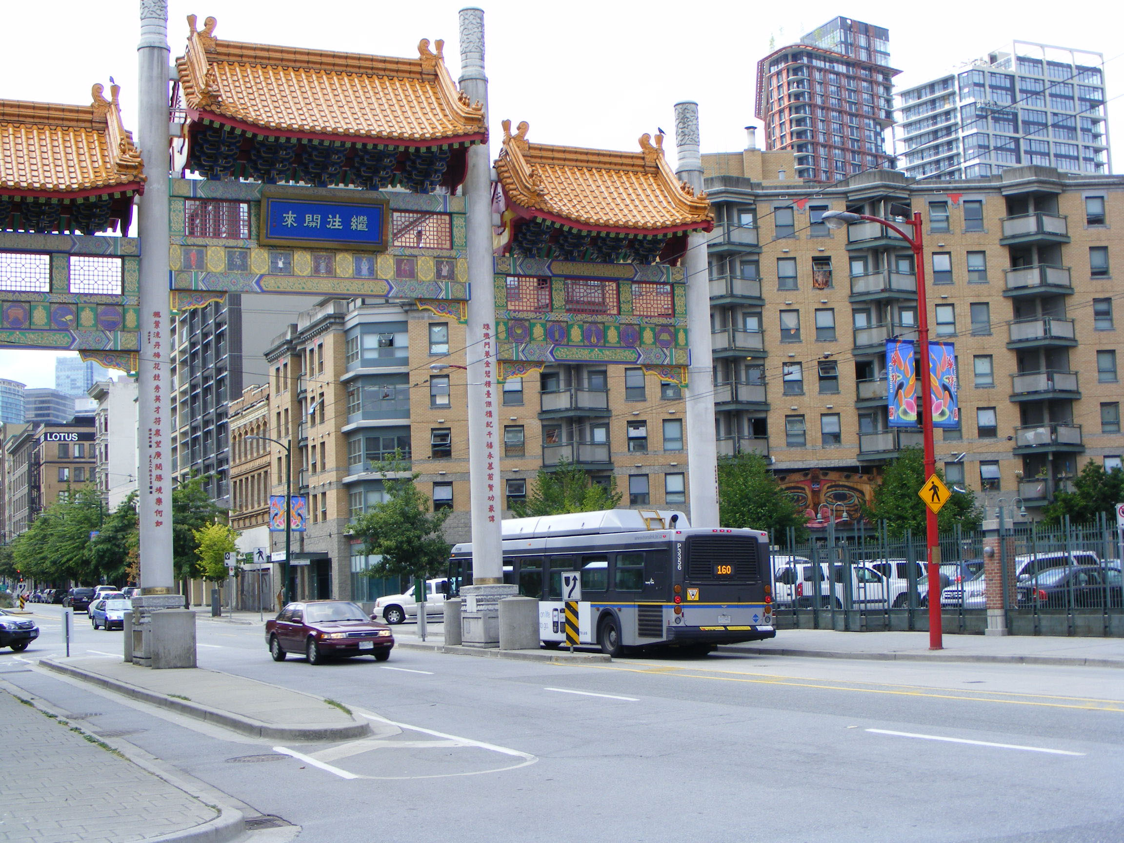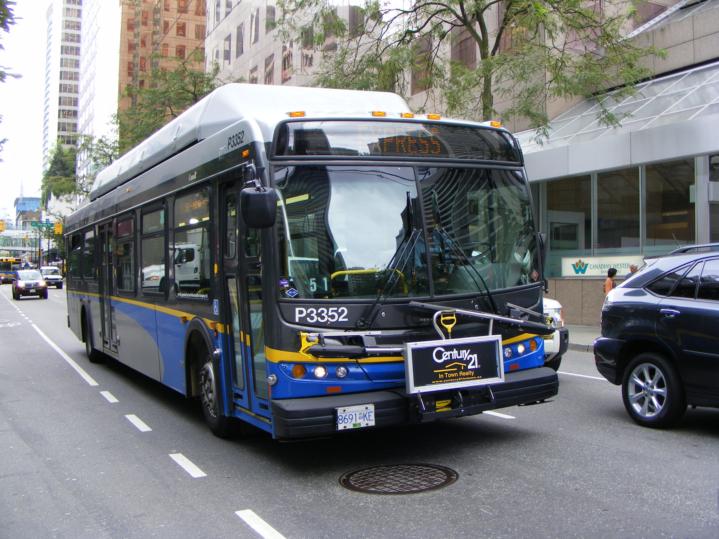 Coast Mountain Bus Port Coquitlam depot is home to the company's fleet of fifty New Flyer C40LFR CNG powered buses. This 2009 downtown view of P3352 shows the roof mounted gas container housing. The bus is on the express route to Coquitlam. |