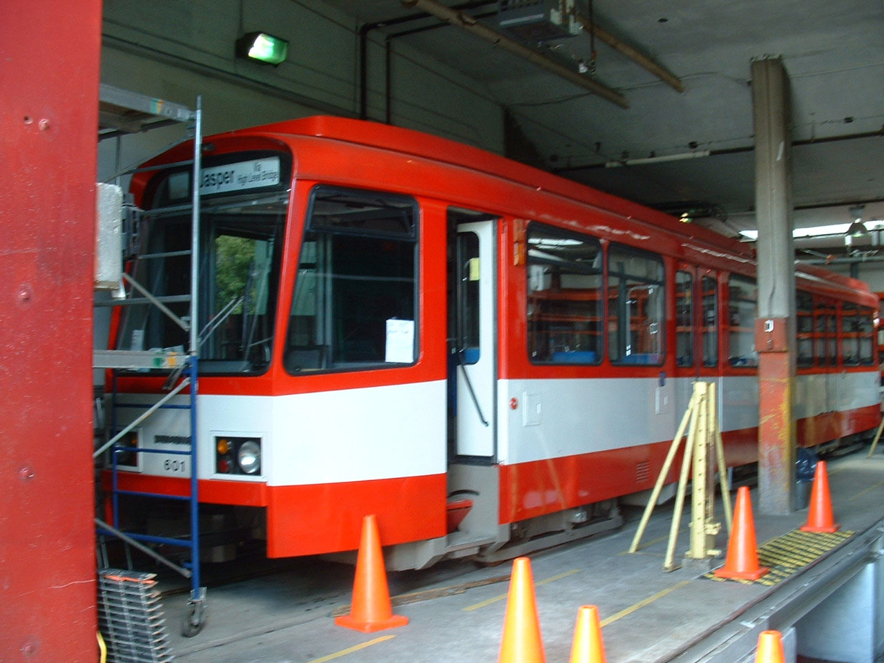 This six-axle high performance tram was built in 1970 as a prototype LRT car for the German city of Hannover by Siemens/Düwag. After running until 1975 in Edmonton, it was acquired by the BC Government as a demonstration car for a proposed light rail system for Vancouver. However, the "Sky Train" alternative was chosen and the tram sat unused on its shipping cradle for almost twelve years. It was purchased by the Edmonton Radial Railway Society in late 1987, it arrived in early 1988 and ran under power briefly at Fort Edmonton Park in 1989. It was stored for years on LRT tracks after being repainted and overhauled electrically and mechanically. The car is in virtually "as new" condition and entered service on the High Level Bridge line in Edmonton 2005. Because of its modern design and large passenger capacity it is mainly used as a back-up car during busy periods. The picture of 601 was taken in August 2007 in the Society's tramshed in Edmonton which is at the Strathcona end of the High Level Bridge line. |