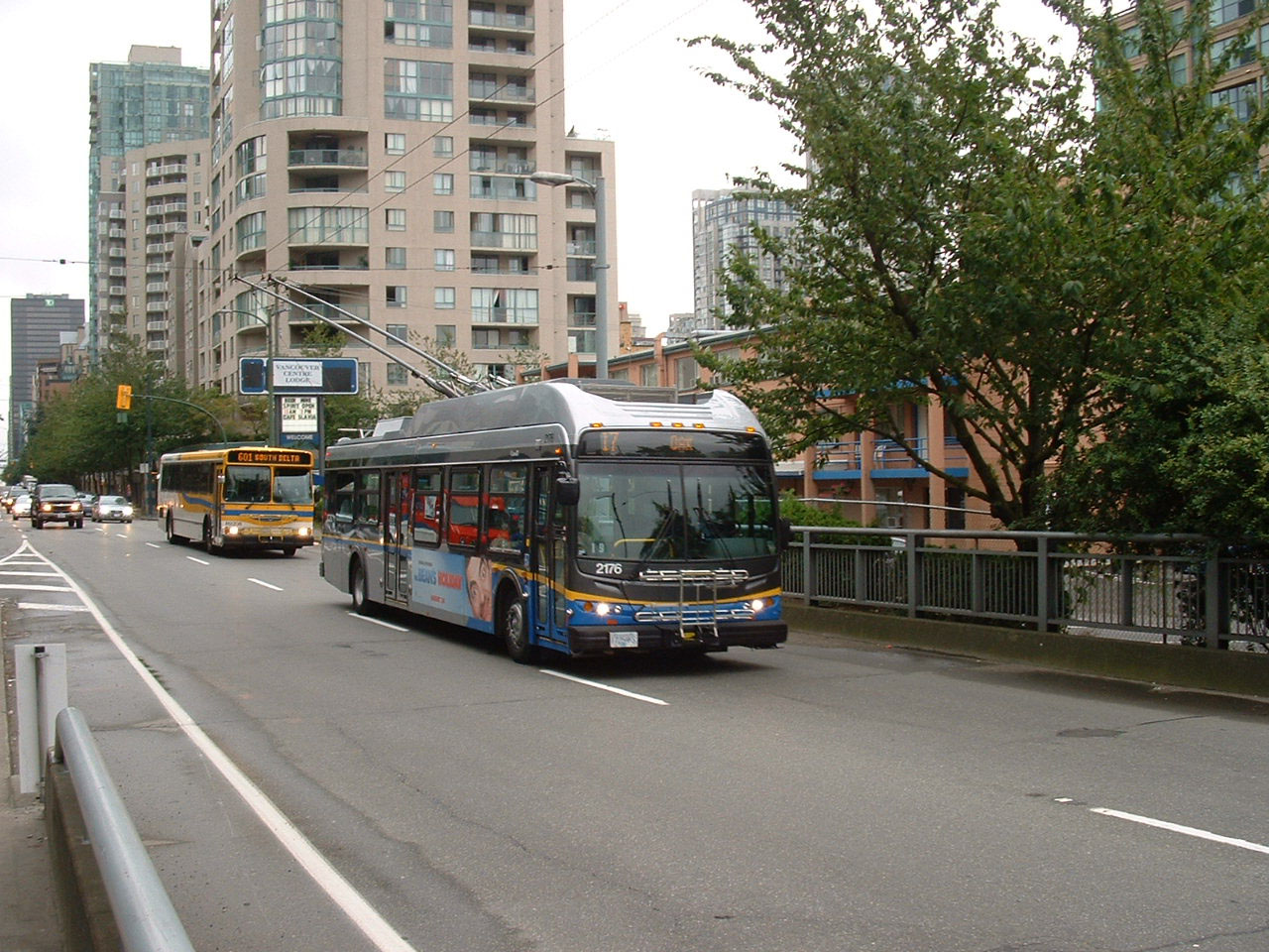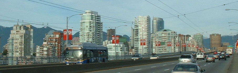 An unidentified New Flyer trolley heads out of downtown Vancouver across Granville Bridge in October 2007. |