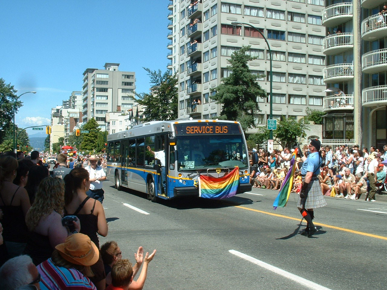 Coast Mountain Bus joined in the annual Vancouver Pride Parade with a new acquisition in the shape of NovaBus LFS 9624. The downtown parade on 5 Aug 2007 included a pink fire engine, this indignity did not befall 9624. Unlike the famous Stagecoach London Routemaster, the fire engine acquired its coat of pink paint voluntarily! |