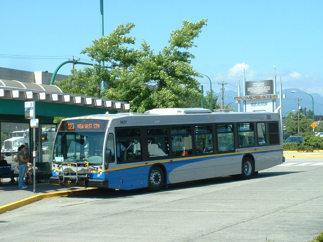 A nearside view of 9622 on layover at Brentwood Station at the same day in August 2007, also minus a depot code, a likely indication of how new to service the Novabus were at the time. They were a departure for Coast Mountain Bus the model having been around since 1995. A predecessor to the Novabus was the MCI Classic, a model just about retired from the fleet in 2007. |