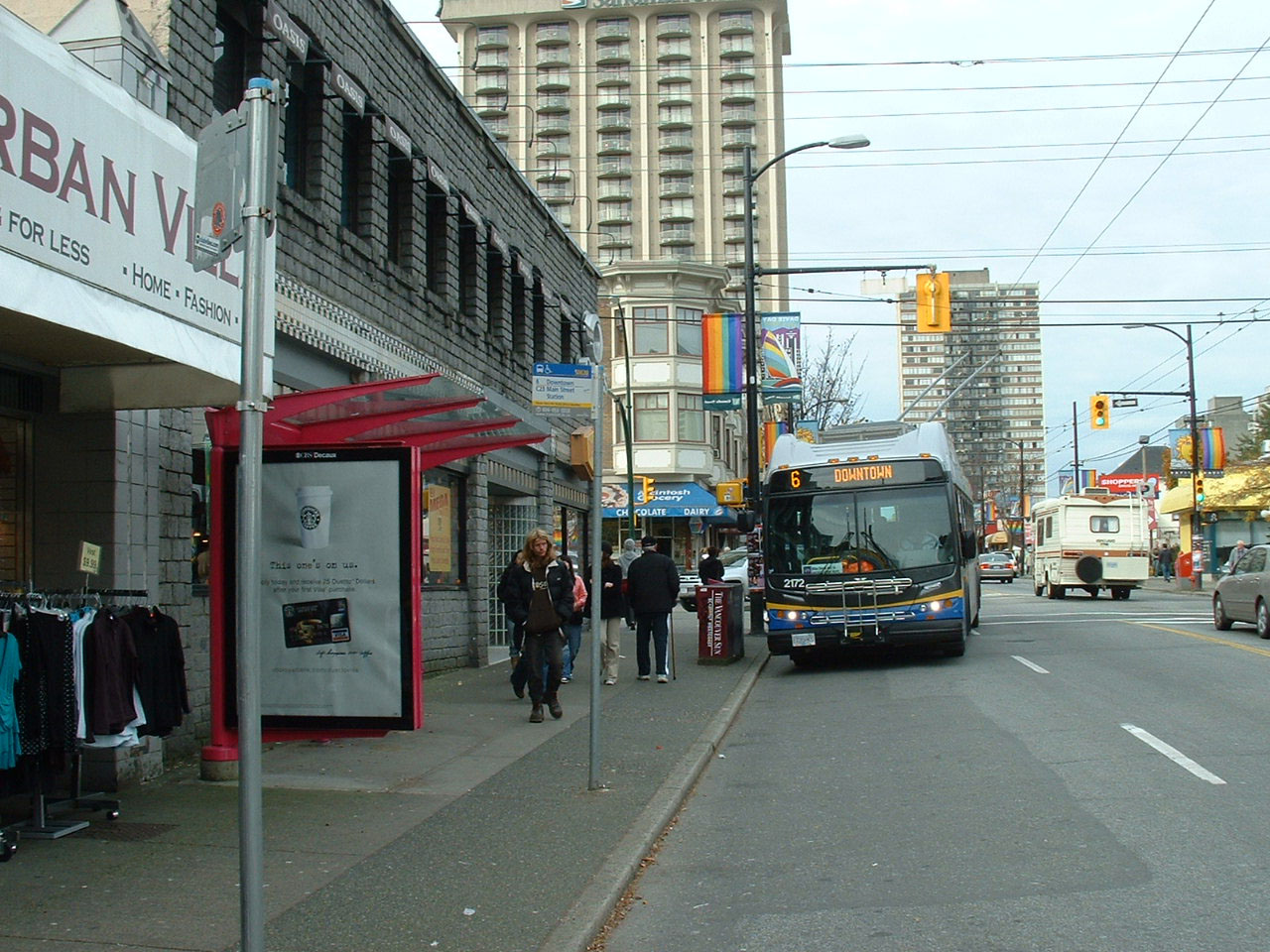 The first E40LFR New Flyer, 2101, was delivered to Vancouver's Coast Mountain Bus Company in July 2005, but the second did not arrive until a year later. By late summer 2007, when 2243 was seen on Granville, most of the 187 rigid trolleys were in service. Kiepe Electric supplied the propulsion systems. |
