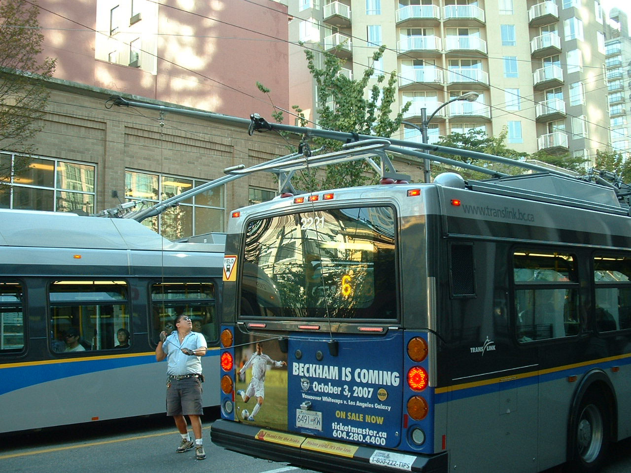 New Flyer 2221 had a dewiring mishap at the junction of Davie and Granville one day in August 2007.
