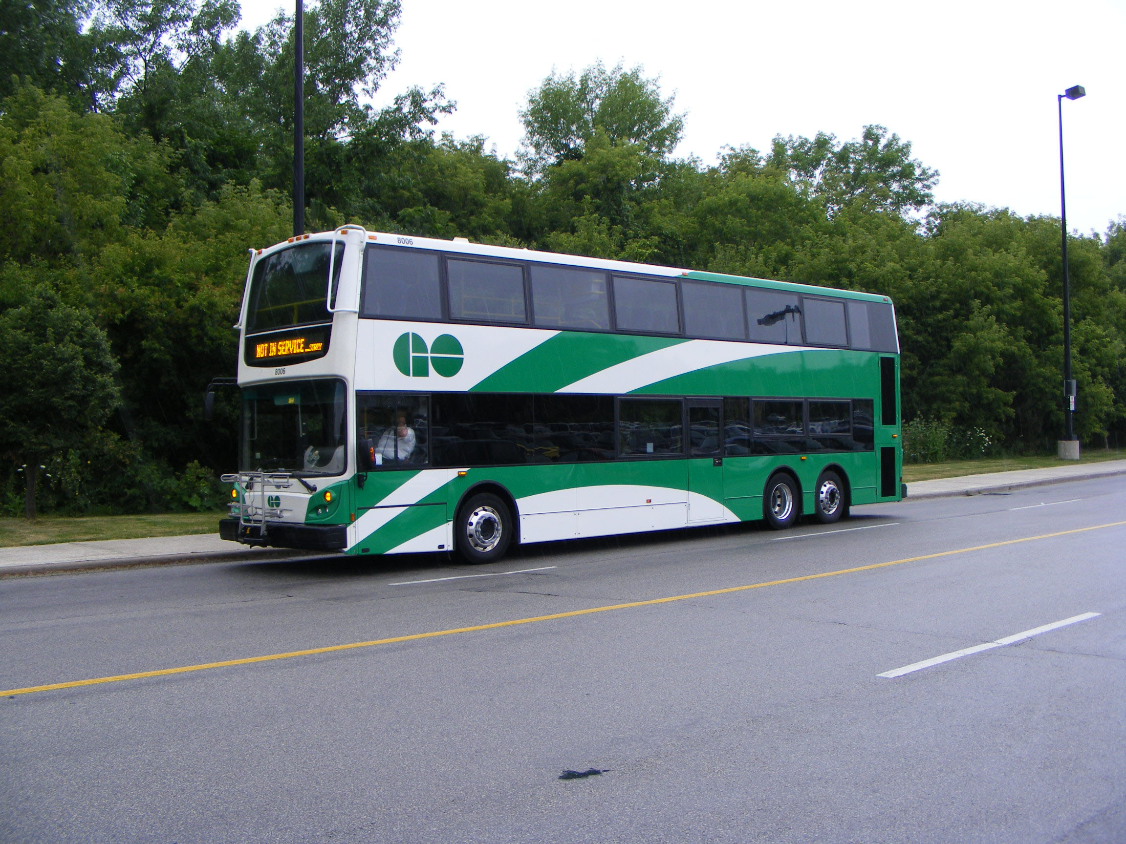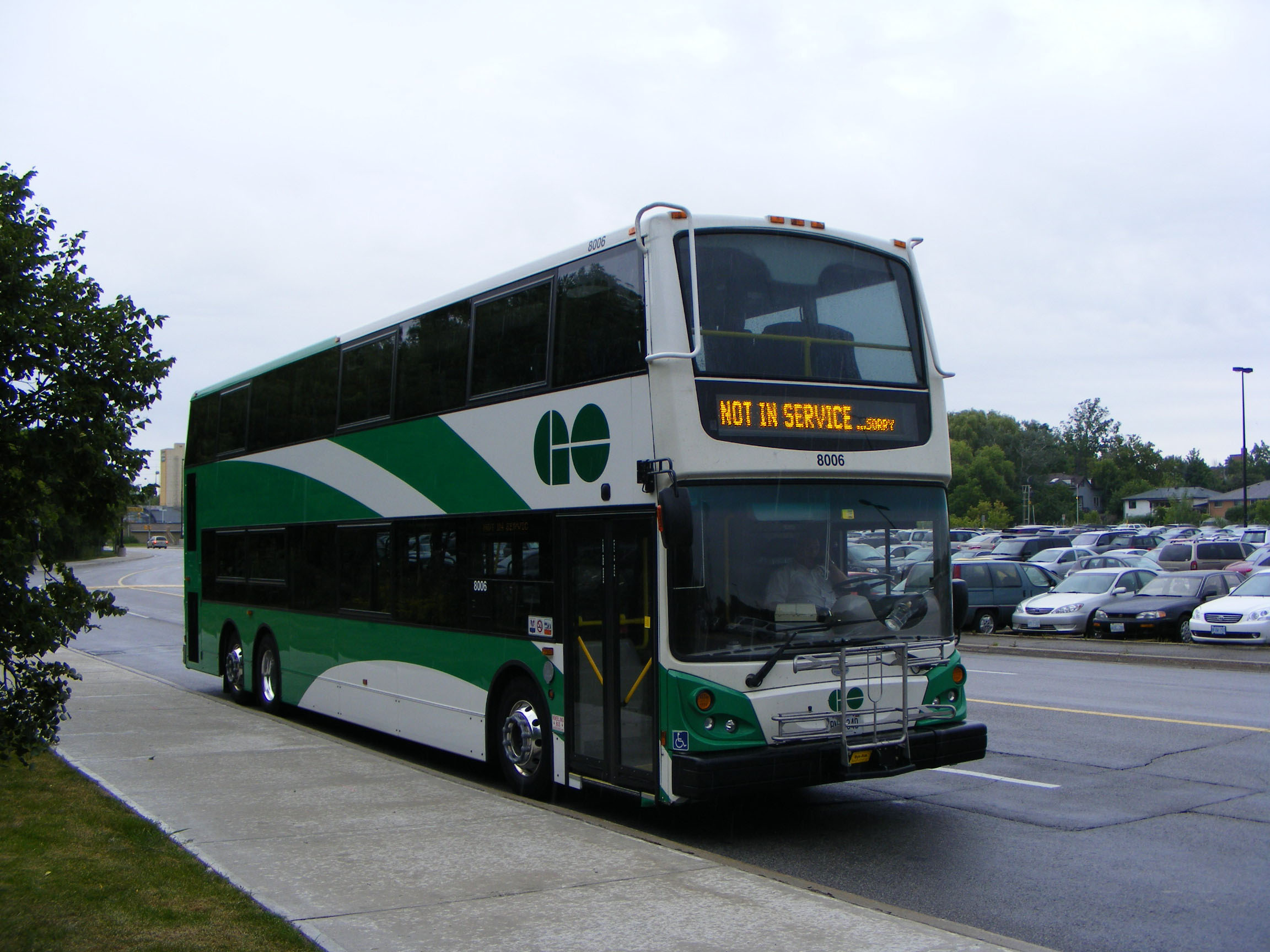 Alexander Dennis Enviro500 8006 arrives at the nearby Streetsville GO Station to take up service on an afternoon run. These first deckers were concentrated on services where large numbers of students were regular commuters and height clearance was no problem.
