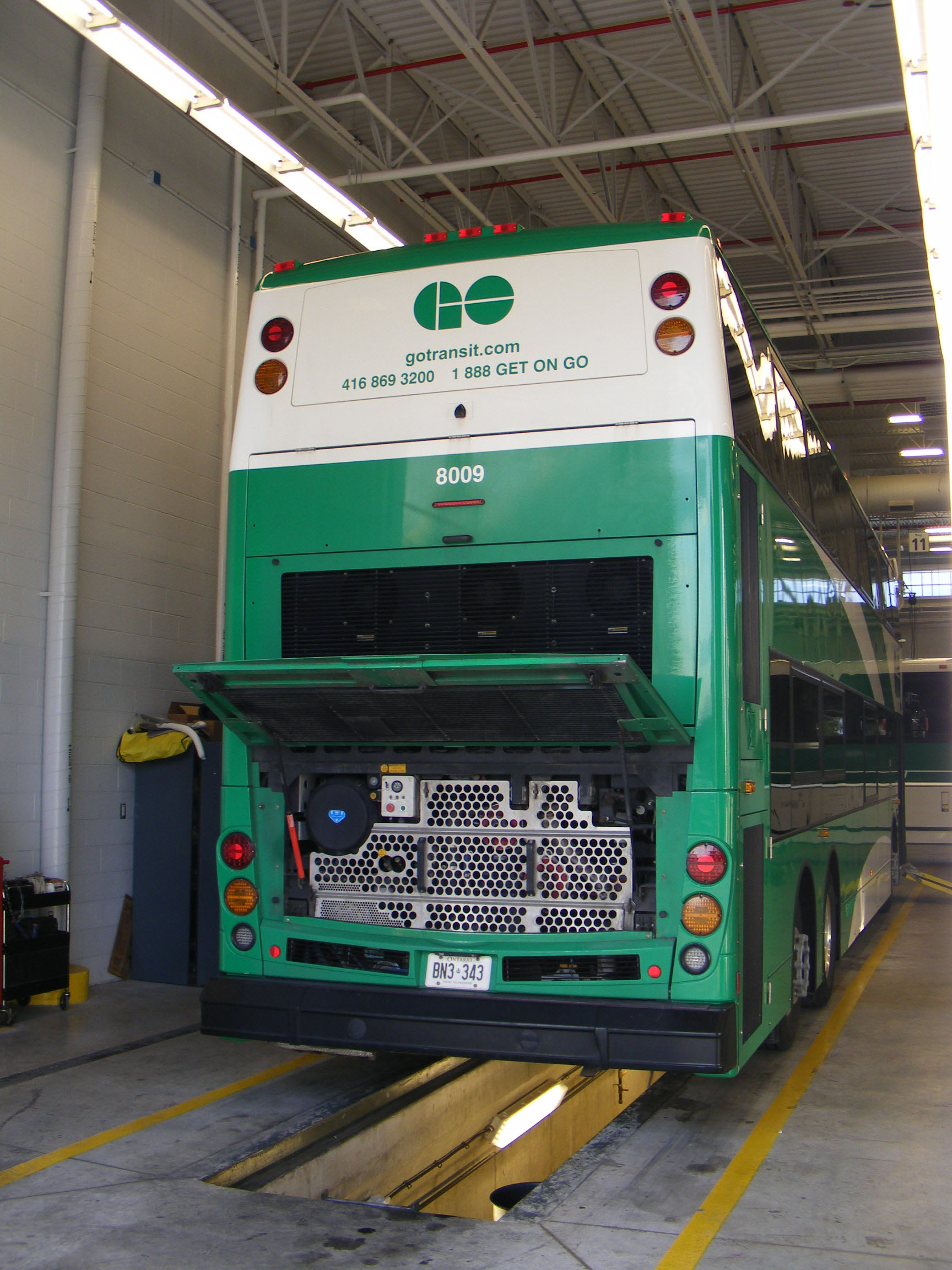 Enviro500 8009 undergoes routine maintenance in the Streetsville facility.